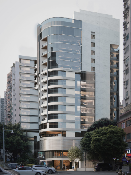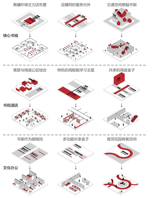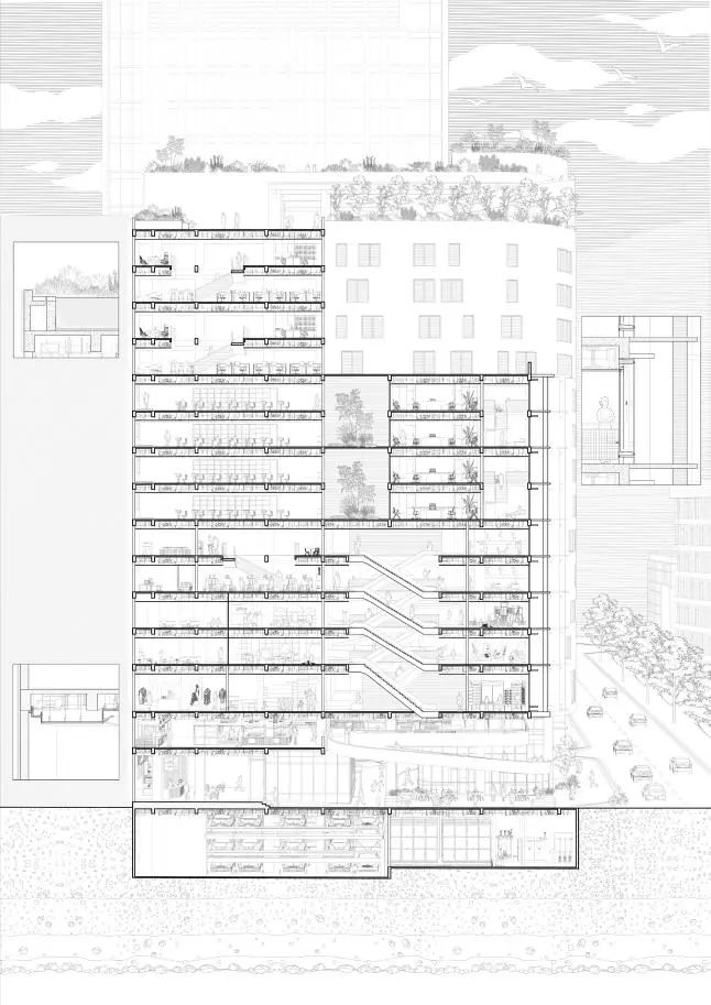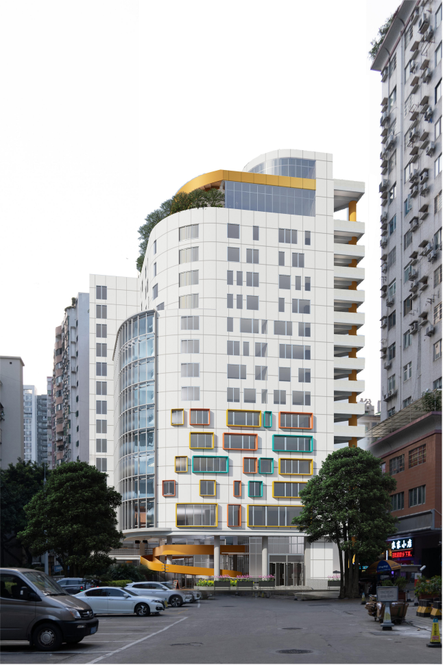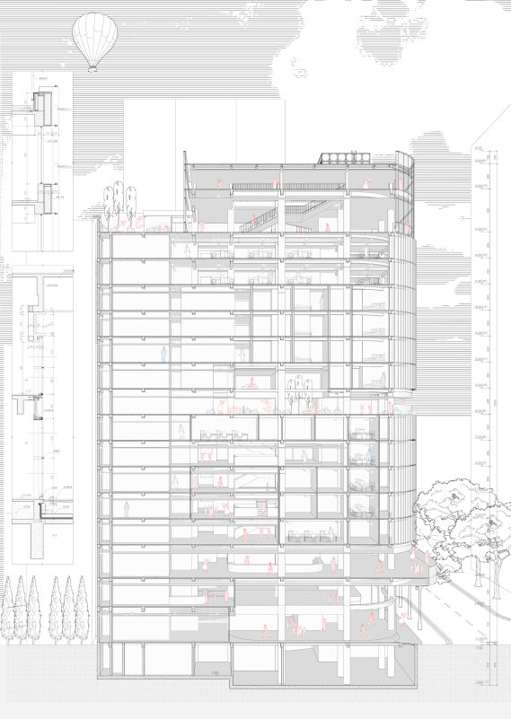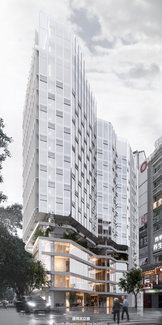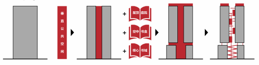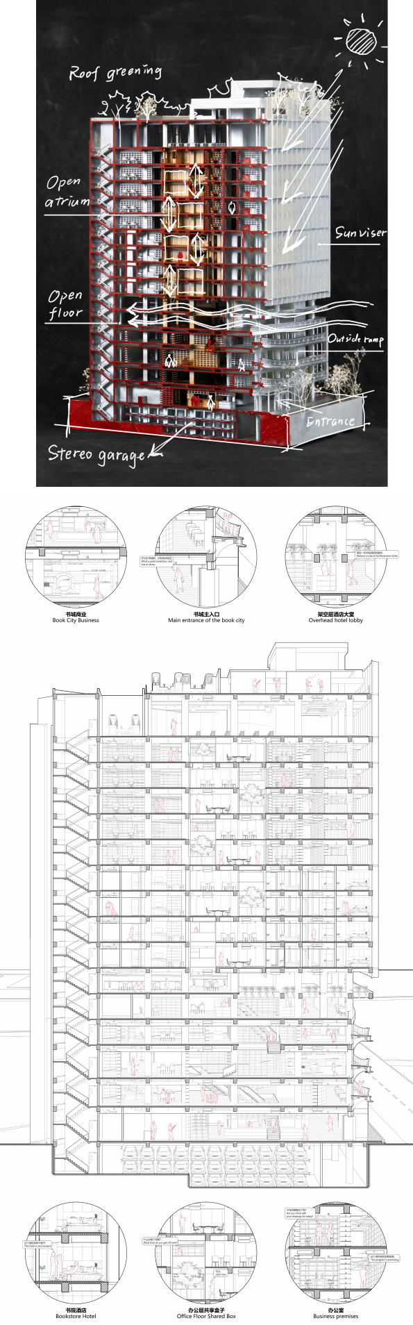 设计说明:建筑所处位置位于广州核心区域,区域内业态完备,富有活力。为充分利用场地周边的教育文化资源,激发周边教育从业者,学生群体及社区居民使用的兴趣,我们认为可以打造一座以“知识服务”为主题的商业办公综合体,即垂直书城。垂直书城包含核心书店,书院酒店及文化办公。我们以一套垂直阅读为主题的不同开放程度的公共空间体系竖向串联并激活了整栋建筑。我们希望本改造设计可与周边商业办公楼形成差异化竞争,同时发挥一定的社会福利效应,作为周边市民的精神文化公共活动中心。