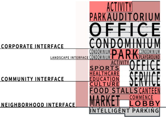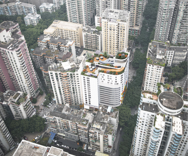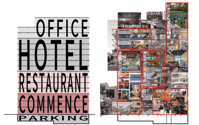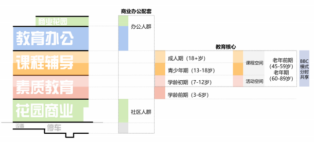 将建筑作为城市的一部分加以考量,基于社区十五分钟生活圈理论引出业态,进而引出在垂直空间上对整体社区的补充与完善。