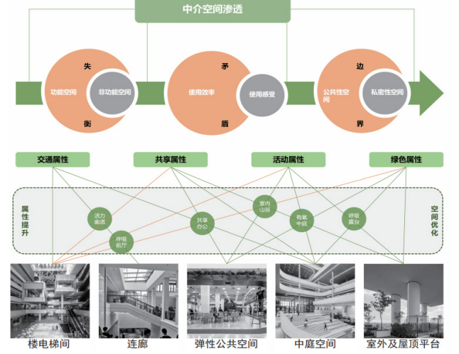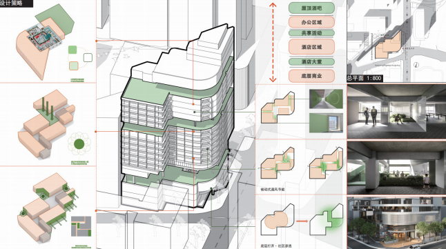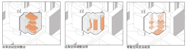 中介空间的多重语义解读,带来了其复合的空间特质,在高层改造的不同功能,不同层级上可以扮演多种角色。在底层商业的部分,中介空间的渗透使得社区的属性提升,显著增加了社区界面街道的活力,在酒店部分,中介空间带来了公共区域的品质提升,同时再生态通风等层面具有更多可能性,在办公区域,中介空间同样以最微小的改动带来了较高的空间使用体验的优化,外廊,电梯厅等零碎空间也通过灵活混合,短期租赁的方式来提升运营层面的商业效益。这些都反映了在设计之初,我们从人的使用体验为视角的切入点。以赋予非定义的中介空间复合属性的方式激活正式的功能空间,从而达到高层整体优化的目的。