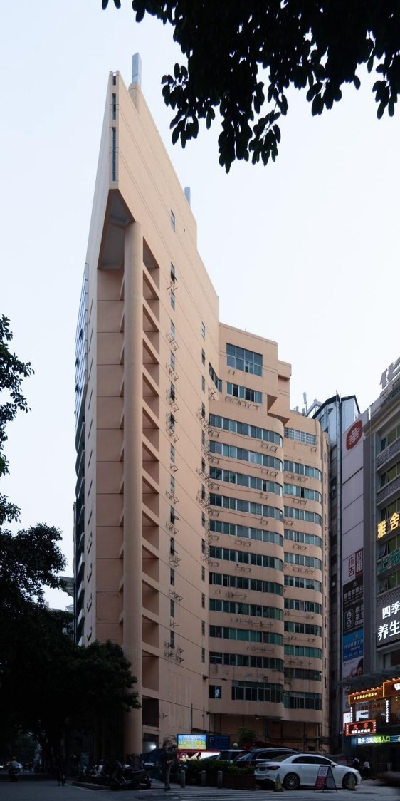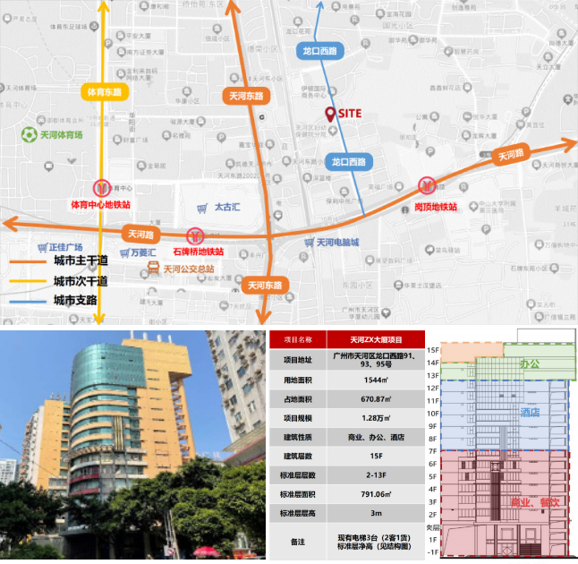 改造对象:课题选址于广州市天河区龙口西路西侧,周边城市资源丰富,主要以居住小区与金融商圈为主。改造目标为一栋具有一定历史印记的小规模的空置楼宇,始建于1995年,竣工时间1998年,总建筑面积约1.3万㎡。建筑原业态为商业餐饮 + 酒店 + 部分办公。