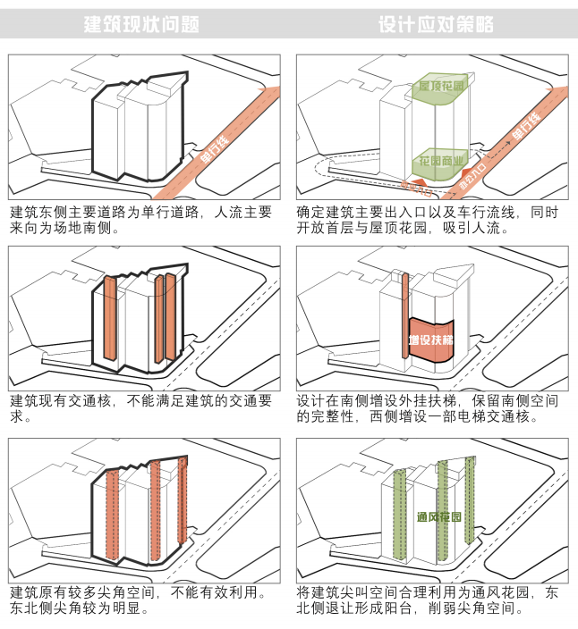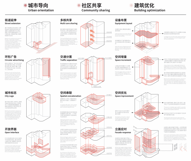 设计说明:设计基于社会学导向出发,关注点落位在如何更好地优化调控该场地社区人居空间结构。通过对周边社区空间结构进行分析,提出“立体社区”的理念,将建筑视作为社区一部分与活力媒介,通过对建筑界面以及层级的突破,突破传统高层建筑消极封闭的空间结构,新的空间基于原建筑的结构体系而构建,在此基础上,通过目标导向的改造策略,最大限度利用原建筑体系同时使新的建筑行之有效地服务于社区,通过城市导向的建立以吸引人流,社区共享的模式以激发活力,建筑优化的策略以提升性能,使建筑成为高效的立体社区