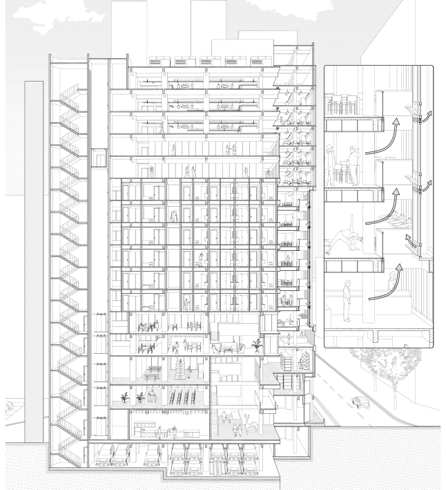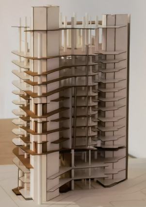 设计说明:我们应该认识到,建筑是由主要的功能空间,以及它们之间所夹的、起连接或服务作用的其他空间所组成。现代主义时期的“形式追随功能”的观念,即是将功能空间置于绝对高位。然而,那些总是站在幕后的、未被单一功能所制约的“空白”应当得到重视,功能空间即使再怎么复合,依然是有形的“实”;而大量的潜能则蕴藏在未被定义的、柔性的“空”中——即走廊、门厅、楼梯间、阳台这些“中介空间”,如何利用中介空间来激活高层整体空间,从而多层级优化使用人群的体验,是我们本次设计希望着重探究的问题。