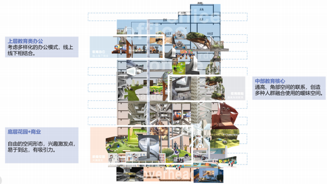 设计说明:设计希望“一站式”、“全龄段”、“多业态”整合教育资源,打造全龄教育综合体。设计创新性的趣学空间以及配套设施,为上至老人,下至儿童的全龄化群体提供知识学习的乐土。通过策划的提出与空间的设计引导教育“兴趣化”、“智慧化”、“共享化”发展。通过微改造注入新活力,实现高层的适应性再利用,满足新时代需求,创造城市附加价值。