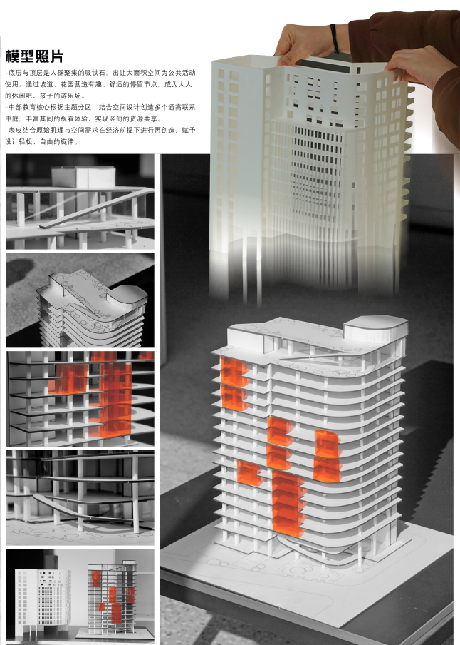 方案点评:1:策划部分具有吸引力,与前期调研、后期设计相互连贯;2:底层开放空间成为城市兴趣点,设计同时满足了高层对于城市的贡献以及自我商业价值的提升;3:各分区平面图表达详细充分;4:模型制作应更加强化设计重点,与图纸重点表达统一;5:立面可进行更加精细化的设计。
