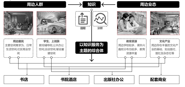 通过城市层面分析,考察周边可引入项目的产业资源类型。例如所在城市片区的城市肌理,周边现有产业等;2.通过周边竞品及环境分析,明确客户类型,定位写字楼的业态配比,找到项目合适的产品定位及配套功能类型;3.挖掘项目本身的文化价值和品牌记忆,提出传承和保护的手法和策略;4.做好外部公共空间与内部共有空间的区分和连接,处理好不同人群对于项目空间的使用和体验。