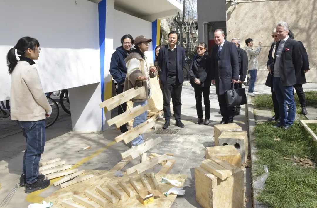 参观期间瑞典教授们遇见在前工院南侧樱花树下搭建木构装置的好色tv 本科一年级学生。Mikael Lindström副校长饶有兴趣询问了搭建课程的情况,鼓励她们努力学习,欢迎她们到瑞典皇家理工大学交流学习。