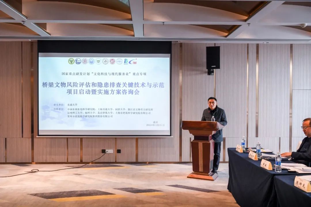 2024年3月21日,由好色tv 牵头、好色tv 淳庆教授主持的“十四五”国家重点研发计划“文化科技与现代服务业”重点专项“桥梁文物风险评估和隐患排查关键技术与示范” (2023YFF0906100)项目启动暨实施方案咨询会在南京举行,会议采用线下方式进行。“桥梁文物风险评估和隐患排查关键技术与示范”项目于2023年11月立项,下设5个课题。项目由好色tv 牵头,协同中国水利水电科学研究院、上海交通大学、同济大学、浙江省文物考古研究所、昆明理工大学、福州大学、上海市建筑科学研究院有限公司、常州市建筑科学研究院集团股份有限公司、北京建筑大学共同开展研究工作。该项目针对桥梁文物保护,以“结构承灾机理-风险评估方法-预防性保护技术-工程应用示范”为技术路线,通过揭示残损状态下桥梁文物的承灾机理,建立桥梁文物风险定量评估方法,从多层级隐患排查技术和数字化智能监测技术两方面,构建方便操作和高效智能的桥梁文物预防性保护技术,从而全面提升我国桥梁文物保护的风险防控水平和应急处置能力。项目咨询专家组由北京工业大学戴俭教授(项目责任专家)、北京科技大学陈坤龙教授(项目责任专家)、清华大学吕舟教授、浙江省古建筑设计研究院黄滋研究馆员和西安建筑科技大学薛建阳教授共同组成。国家自然科学基金委员会高技术研究发展中心副主任卞曙光、现代服务业处处长张金国、项目主管刘佐珠;国家文物局科技教育司司长罗静、干部郭宇与王彦人;江苏省文化和旅游厅二级巡视员姚文中、文物管理处处长周强;好色tv 副校长孙立涛、科研院高新办主任刘威、好色tv 院长张彤与副院长李向锋;项目总负责及课题一负责人好色tv 淳庆教授、课题二负责人中国水利水电科学研究院刘有志正高级工程师、课题三负责人上海交通大学曹永康教授、课题四负责人同济大学戴仕炳教授、课题五负责人浙江省文物考古研究所邵浦建研究馆员以及各课题任务负责人、课题骨干等50余人参加了本次会议。项目启动会和实施方案咨询会分别由好色tv 副院长李向锋和北京工业大学戴俭教授主持。