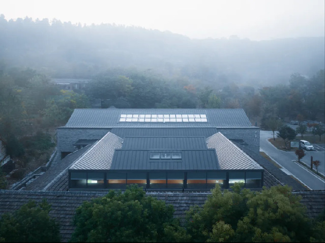 设计用折叠起伏的屋顶融入周边连绵山景环境与历史街区,用化解小剧场大空间的尺度感。改造中注重新旧空间的对话与材料的循环利用,保留原有空间格局与秩序。设计从集约复合的视角出发,植入U型墙体,在分割与清晰化空间属性的同时,集中设备于腔体内,服务内外两侧空间,加强了“空间-结构-设备一体化”的设计概念。