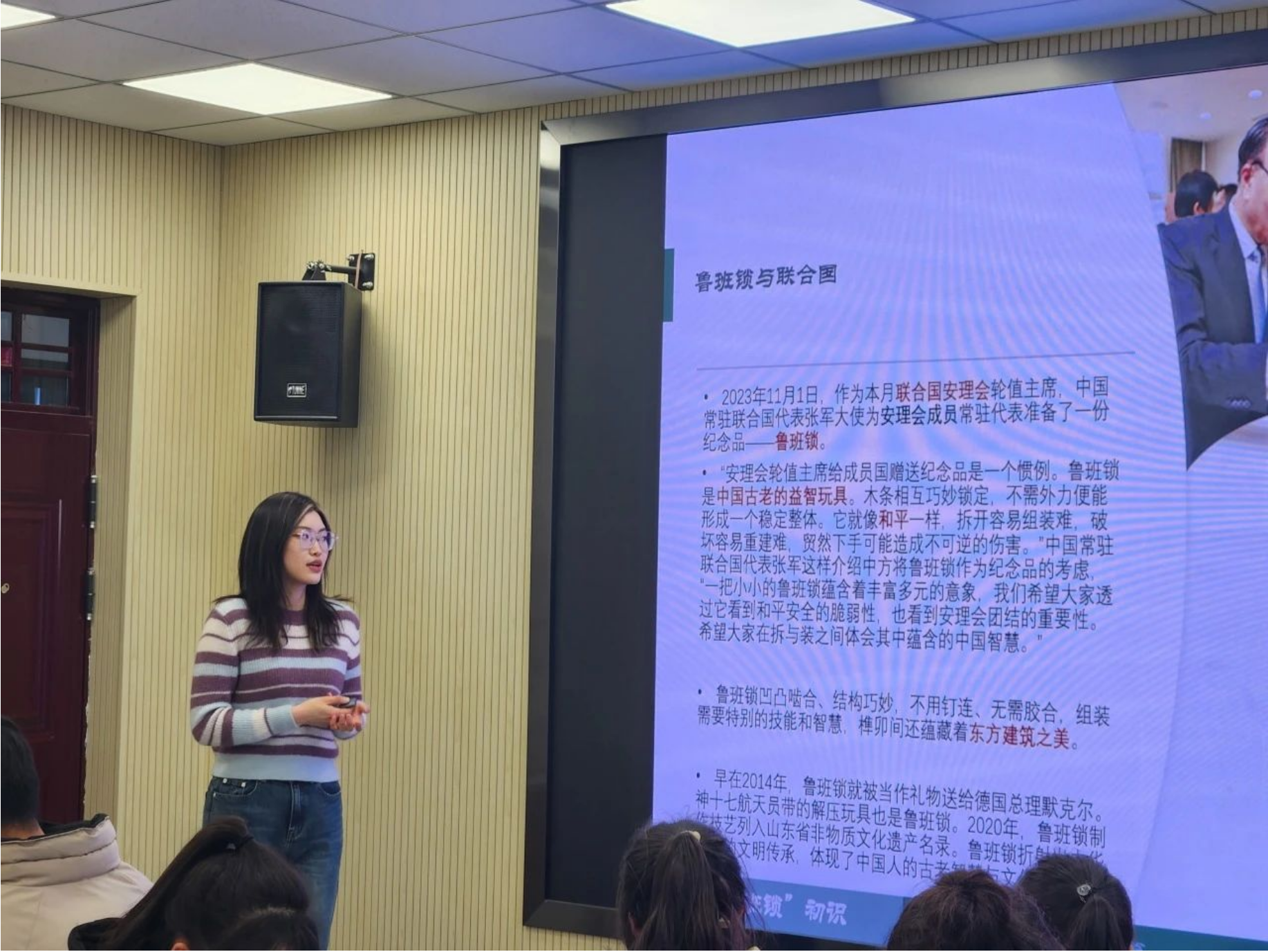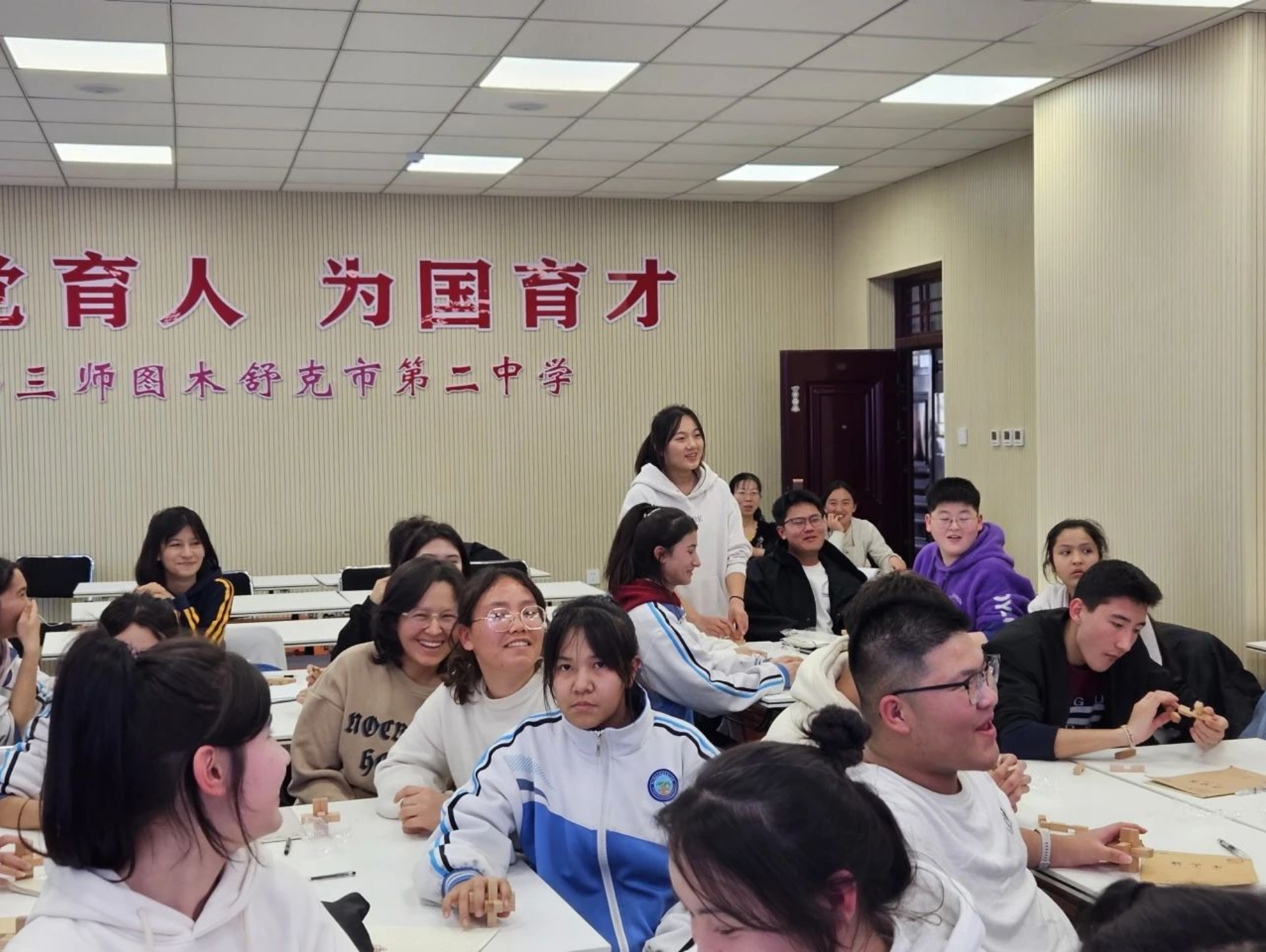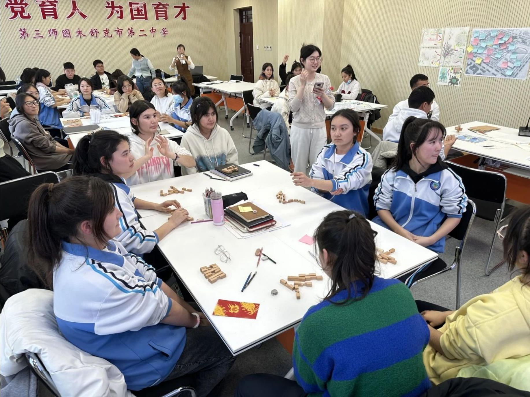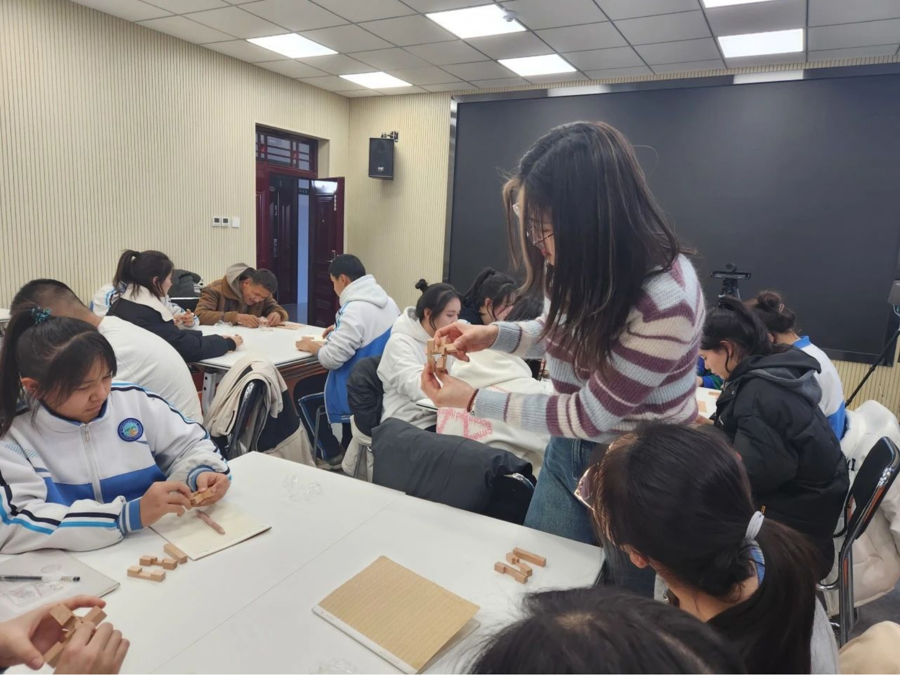 在活动过程中,虽然很多同学第一次接触鲁班锁,但是对鲁班锁拆解拼装表现出强烈的热情,在课堂和活动中积极探索、踊跃参与。小小的鲁班锁通过简单的木构件组合在一起,但初次拼装起来实则并不容易,师市二中的同学们相互帮助、共同学习,正像是鲁班锁所代表的“团结”精神,传达出这次活动的真正价值。