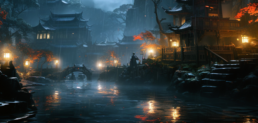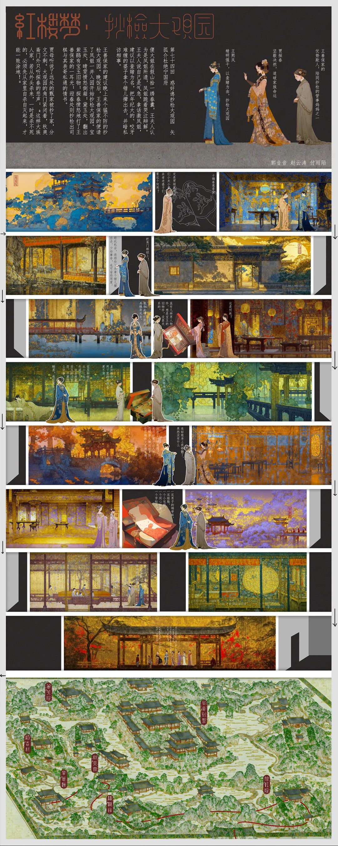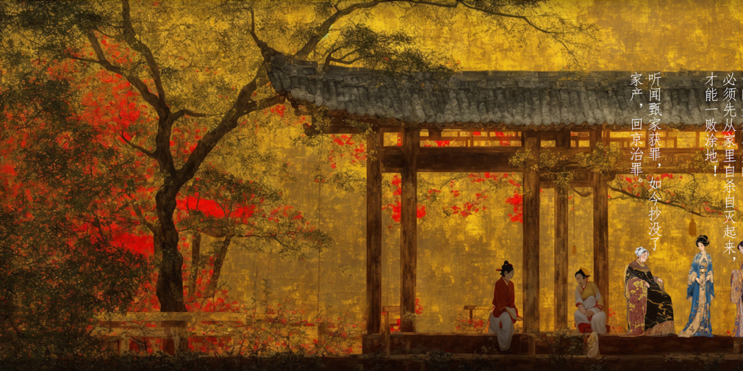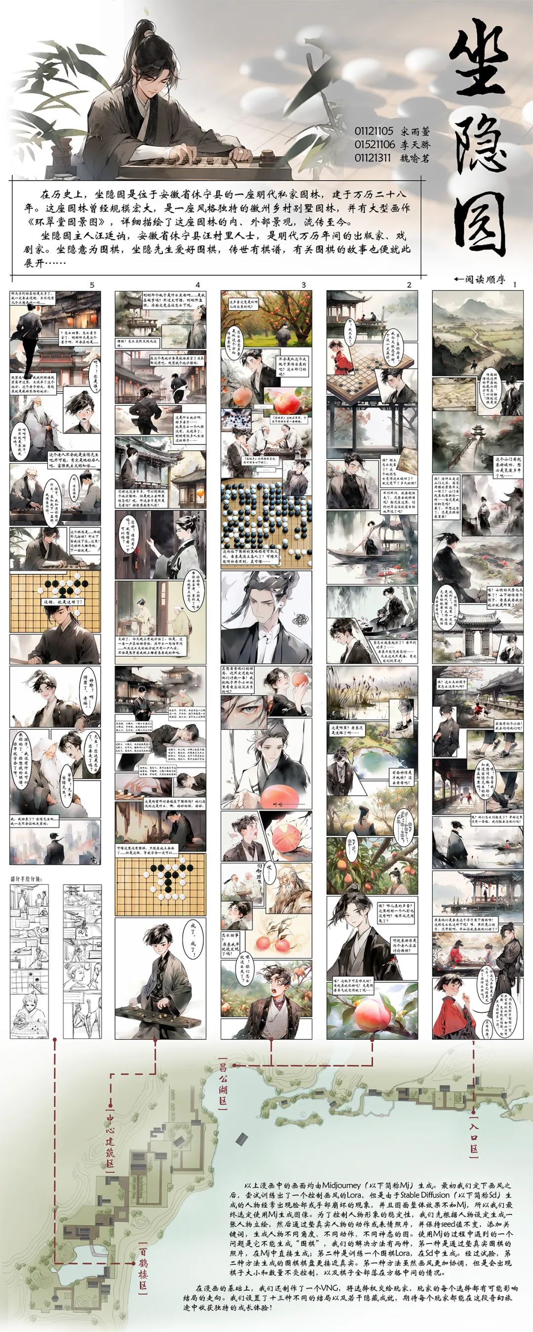 选择一个历史上曾经存在或仅存在于文献中的园林,根据文献资料用AI重现该园林形态;选择一个耳熟能详的故事片段,使其自然的发生在重现的园林中,每个故事场景需对应于总图中的位置和观察方向。