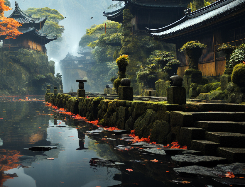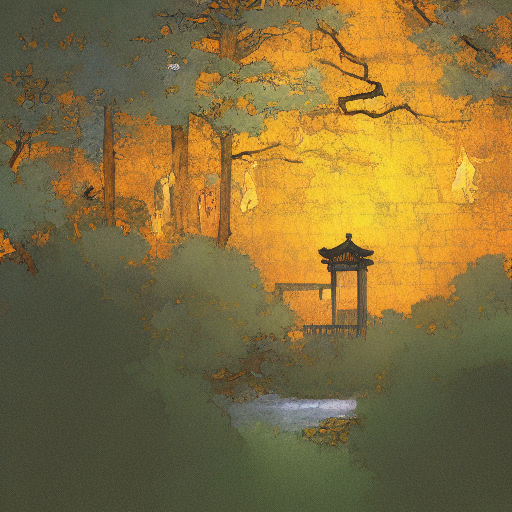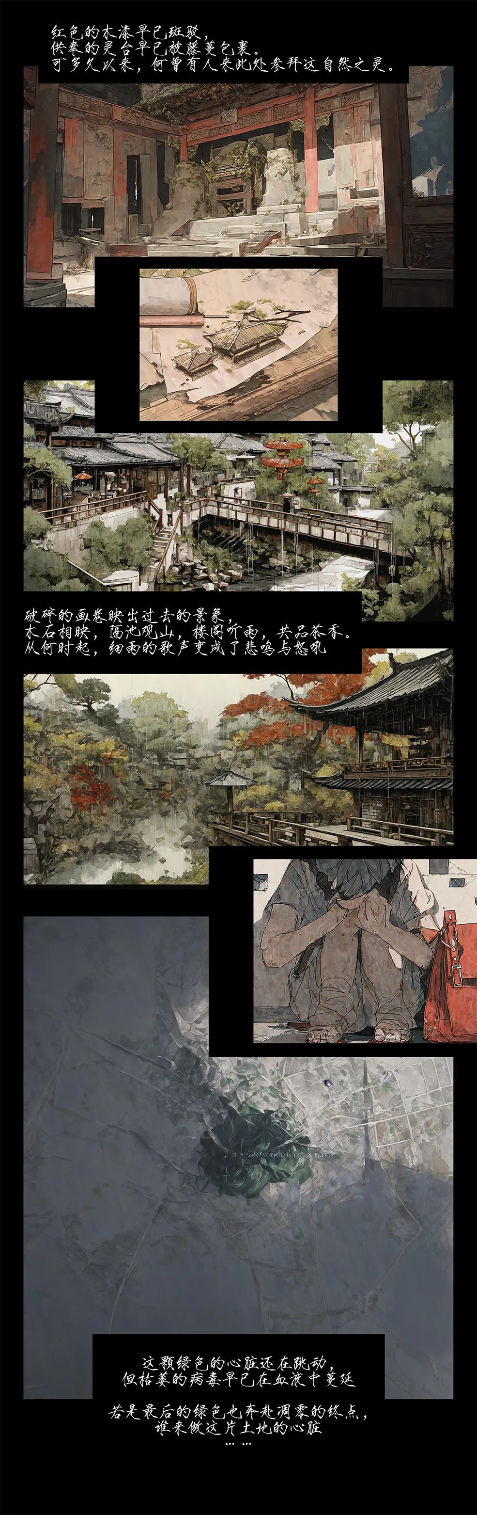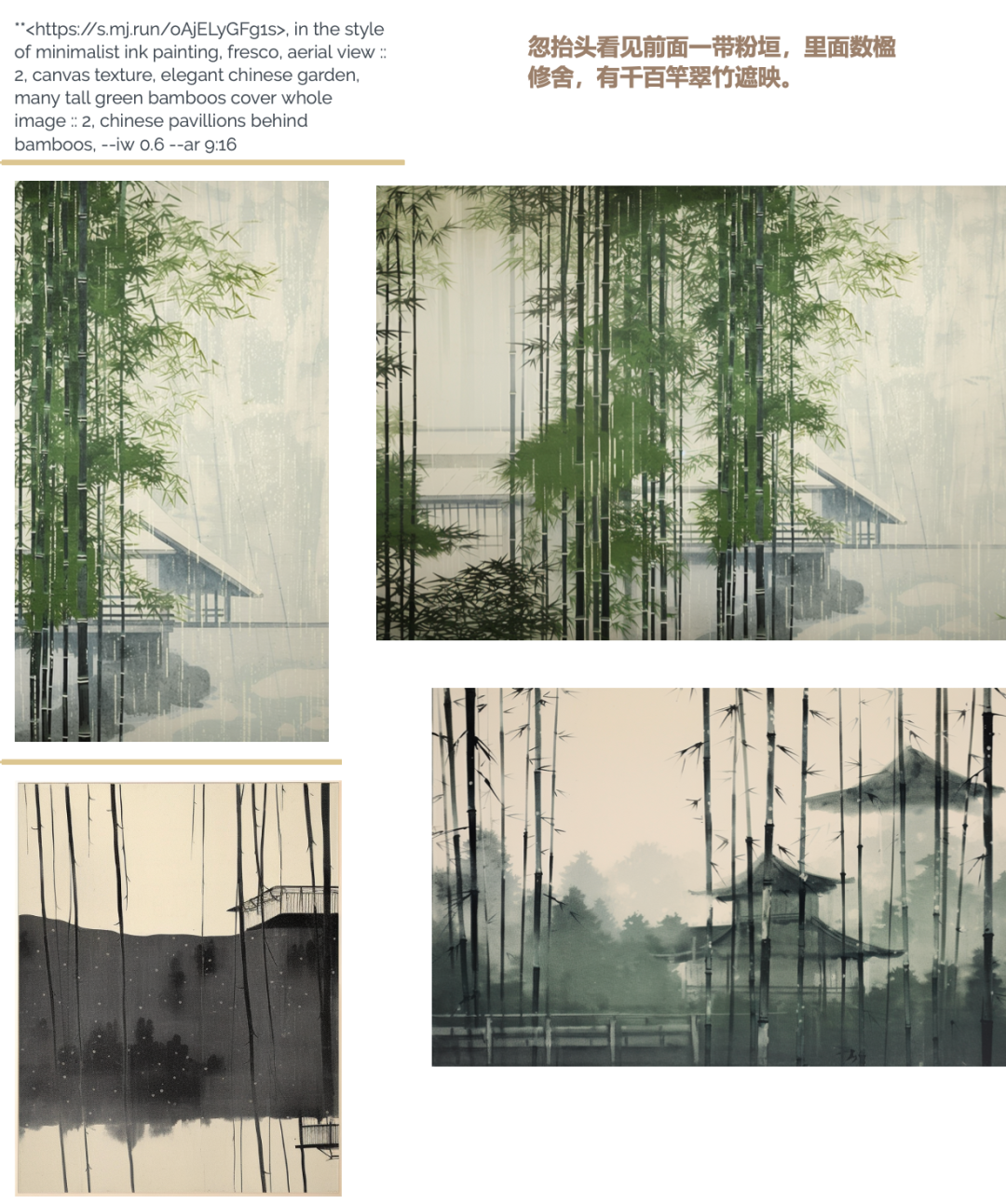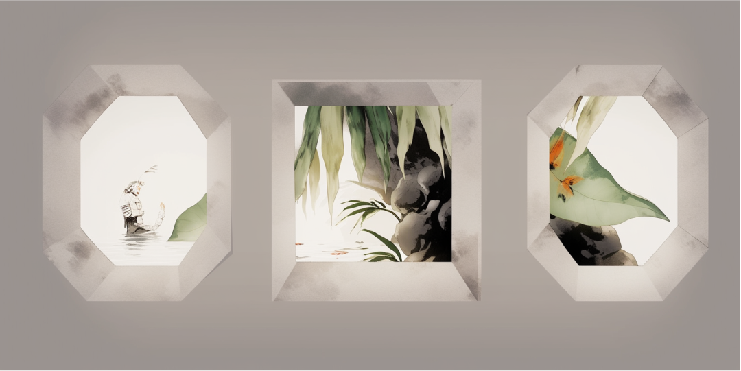 在古代文献中选择一段描述园林的文字(诗句、山水画上的题跋、园记),用英文对其进行扩写,生成四组图像。每一组图像包含大中小三个尺度(全景图、局部透视、细节刻画)的三张图片。