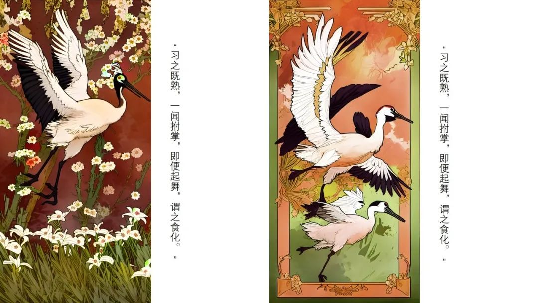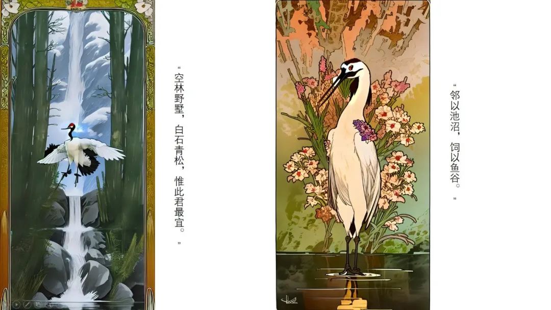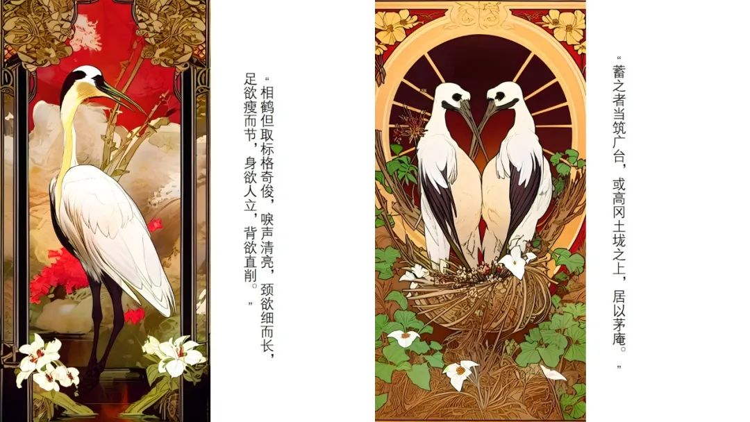 新艺术运动风格(以穆夏Alphonse Much作品为样本)与中国鹤形象的融合。