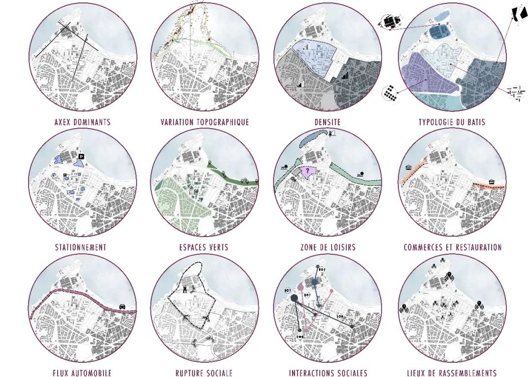 第五组汇报的是Anas Berrada El Maadi,他分享的项目名为“抚平卡萨布兰卡的伤疤” 。卡萨布兰卡是摩洛哥的经济首都,这个项目主要探索了卡萨布兰卡27公里的城市岸线,它既是沙滩和海洋爱好者的梦想目的地,也包含生物多样性的自然序列,以及作为经济枢纽的港口工业序列。与理想的规划愿景相比,多年来的现状是一幅对比鲜明的画面,一方面是不稳定、不卫生的贫民窟,另一方面,规划的街区也有衰退的迹象。项目关注社会结构和参与性的方法,尊重地方的集体记忆,试图弥合空间的断裂。