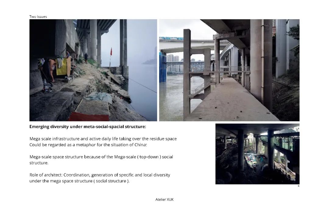 上午最后一位报告的嘉宾是旭可建筑事务所联合创始人刘可南,他通过对中国城市化进程、基础设施空间、当前工业体系下的中国建造等议题切入,分享了项目中面向现实的解决策略。在介绍最后一个项目“桥下舞台”时,视频展示了桥下的市民生活场景,真实的、流动的日常生活随着镜头的推进而切换,也将现场参会者引向了对场所的体验和再思。项目采取了轻介入的策略,通过设计引导人流翻越被防汛墙分隔的空间,并结合现有空间特征创造鼓励公共使用的可能方式。