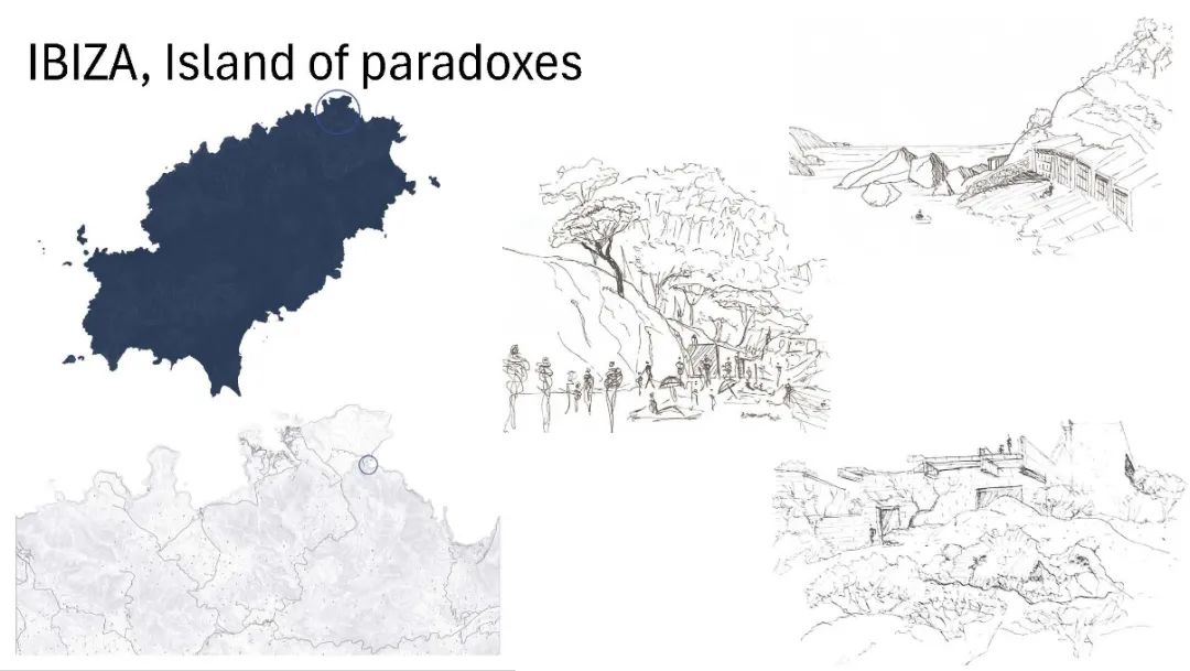 第四组汇报的是Marine Ceulemans, 她的研究主题是 "孤岛"。我们生活在一个充满思想、运动、流动、人口和商品的世界,而岛屿则是边缘化的。由于其有限性所带来的脆弱性,岛屿比其他任何地方都更能孕育真正的生态意识。为了将方法扎根于现实,她选择了西班牙巴利阿里群岛的伊比沙岛展开设计讨论。