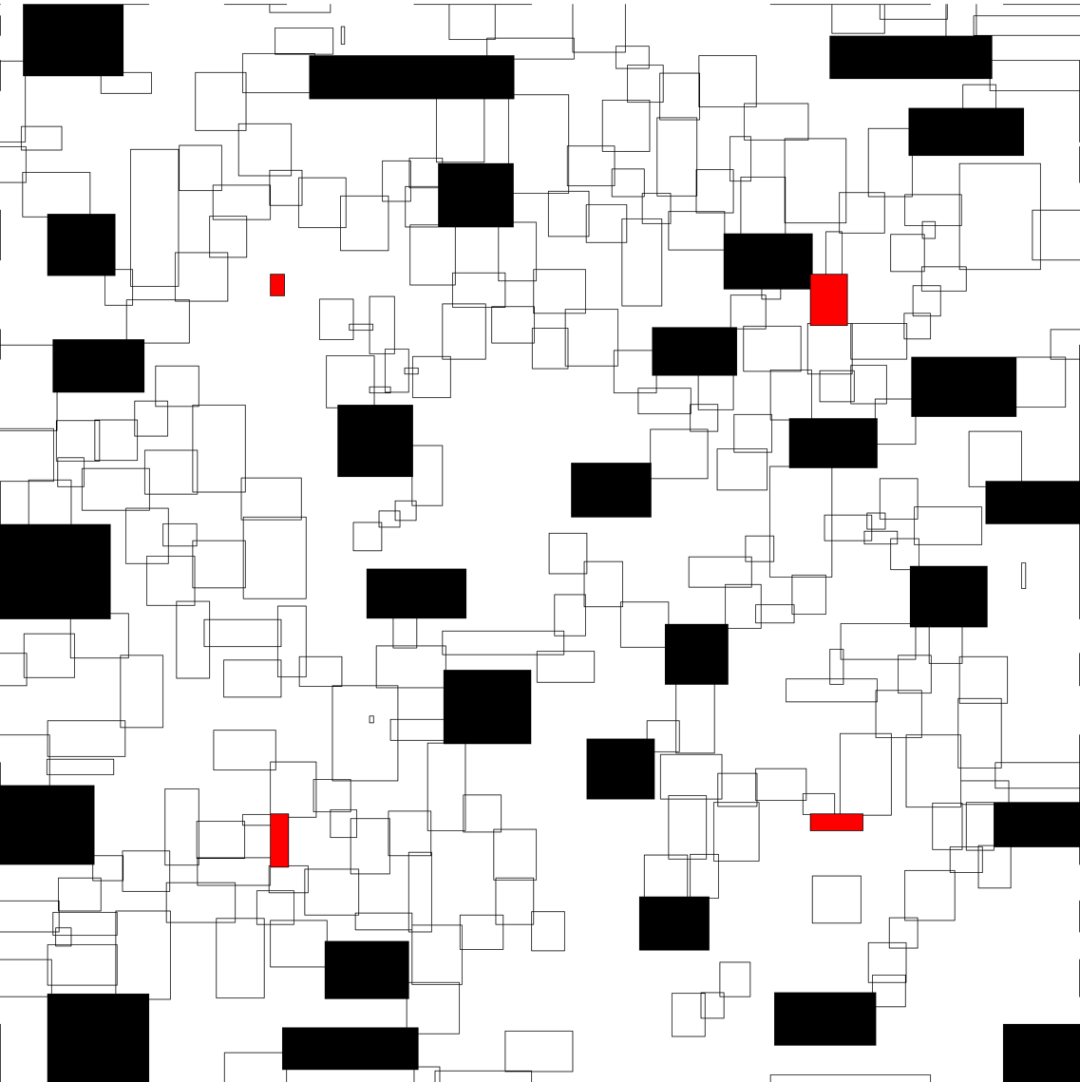 自组织(self organization)的博弈过程形成了住区总平面的楼栋布局。每个住宅单元所在的领域以一个尺寸可变的长方形来表示。每个长方形试图膨胀至较为充裕的面积。所有长方形在基地内相互竞争,一方面促使容积率上升至较高的预定值,另一方面保证了楼栋之间的间距与日照条件。