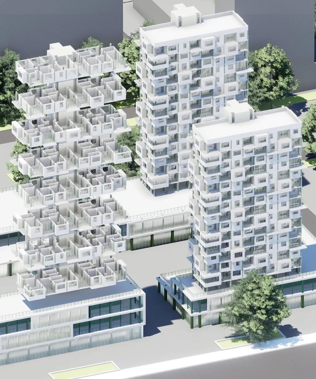 迭代运行的仿射变换(旋转、平移、镜像)生成了众多L形图元构成的分形。受到路易斯·康的理查德医学研究所(Richards Medical Research Laboratories)的结构形式的启发,调整宏观参数的取值,生成了极其多样化的平面构图,进而把最合适的平面构图映射到住宅结构与空间。通过形式语法的参数来控制L形剪力墙之间的间距,使其能够在不同的时段、不同的楼层容纳多种房间布局,但应避免跨度过大导致的高昂造价和厚重楼板。