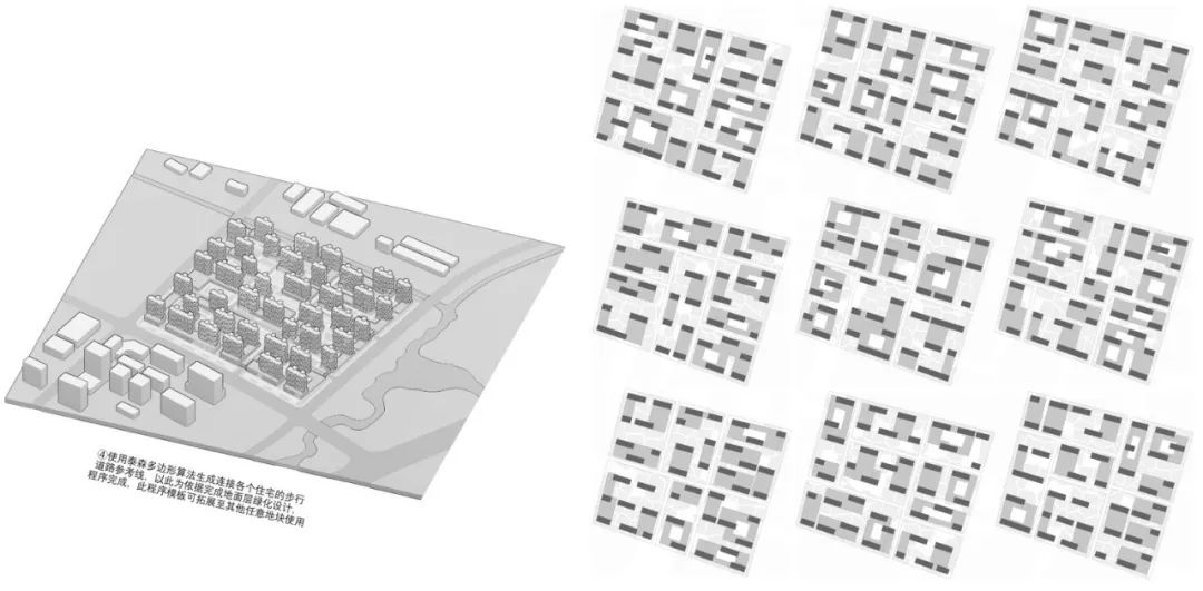 在场地内设置若干吸引子(attractor),作为小区内几个组团的中心点。众多长方形在场地内自发生长,同时受到吸引子的影响,进而通过聚类算法与自动筛选形成了合理的室外空间与住宅单元布局。