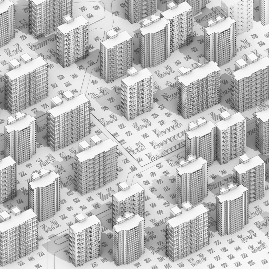理论著作 The Logic of Architecture(1990)提出了在计算机背景下利用语法来描述建筑形式的完整理论。本方案利用形式语法(shape grammar)定义了住宅主体结构和住区总平面格局。以L形为母题的风车状生长模式,跨越了结构构件尺度(厘米)与城市地块尺度(百米),形成一种长期的城市居住基础设施,容纳未来的各种未知套型。