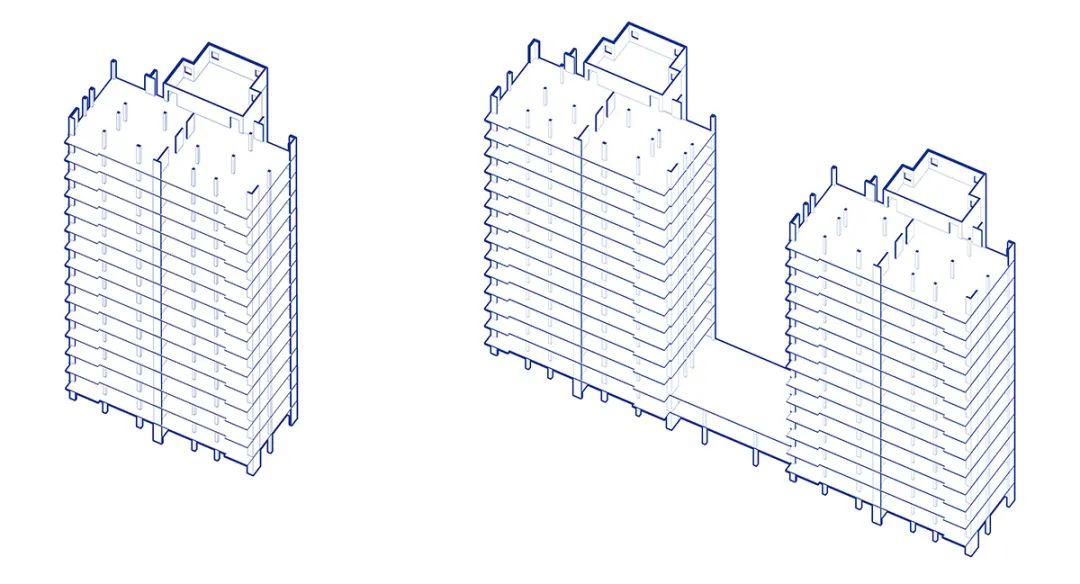 为了降低综合成本和保持长期高效,将固定的钢筋混凝土结构作为一种长期服务于居住的基础设施,尽可能支撑未知的未来套型。针对这个设计挑战,本次“高层住宅设计AI”四年级设计课通过计算机编程进行运算化设计(computational design),探索相对稀疏的框架剪力墙结构如何与多种套型在不同的时空中共存,模拟高层住宅的承重结构(寿命100年)对居住空间(如20年更新一次)的多适性。