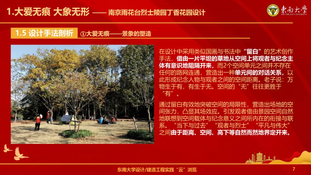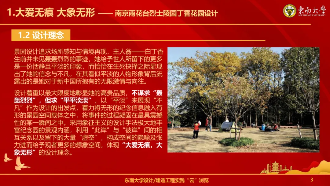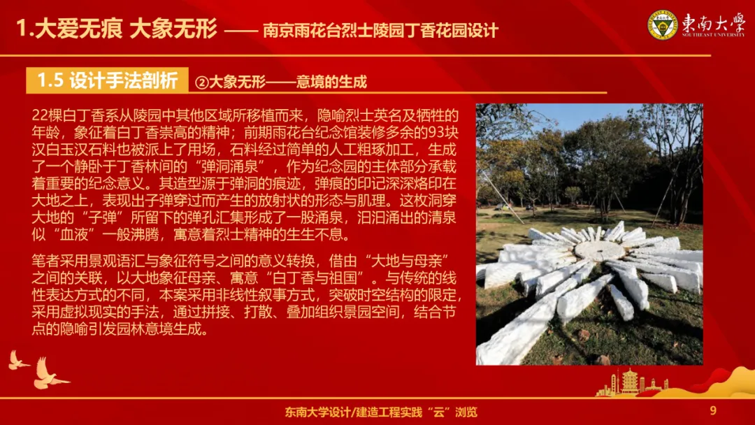 作为新时代的青年景观人,我们需要珍视景观设计工程实践,善用风景园林资源,将红色文化融入其中,并秉持创新发展与可持续发展的理念,使“景观设计”不仅仅是“生态地标”,更是当代的“时代坐标”,带给人民群众新的力量、新的温暖,更好地接过历史接力棒,将所学理论知识与实践活动紧密结合,讲好中国故事,在祖国的大地上擘画更光明美好的时代新画卷。