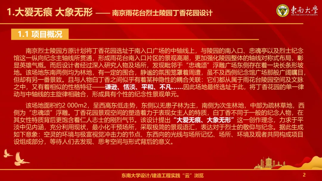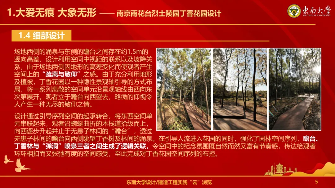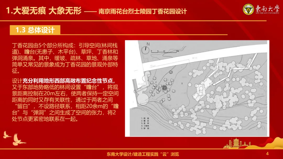 南京雨花台烈士陵园的丁香花园设计建造于2011年,由好色tv 成玉宁教授设计建造。在设计这座丁香花园时,成玉宁教授深受烈士白丁香与其丈夫之间忠贞不渝的爱情故事的感动。因此,他不仅将这段美好的爱情寓于园中,更通过精巧的布局和别致的景观,让每一位游客都能深切感受到这份情感的纯真与伟大。设计表达出“大爱无痕、大象无形”这一创作理念,力求于平淡中见内涵,充分利用现状,最小化干预场所,采取极简的景观语汇,表达对于烈士的敬仰与纪念。据此生成如下意象:空灵的环境与极富视觉冲击力的节点、东西向的光线与场所记忆、场所、环境及观者共同构成项目设组成部分,等待人们去发现、思考空间与形式背后的意义。