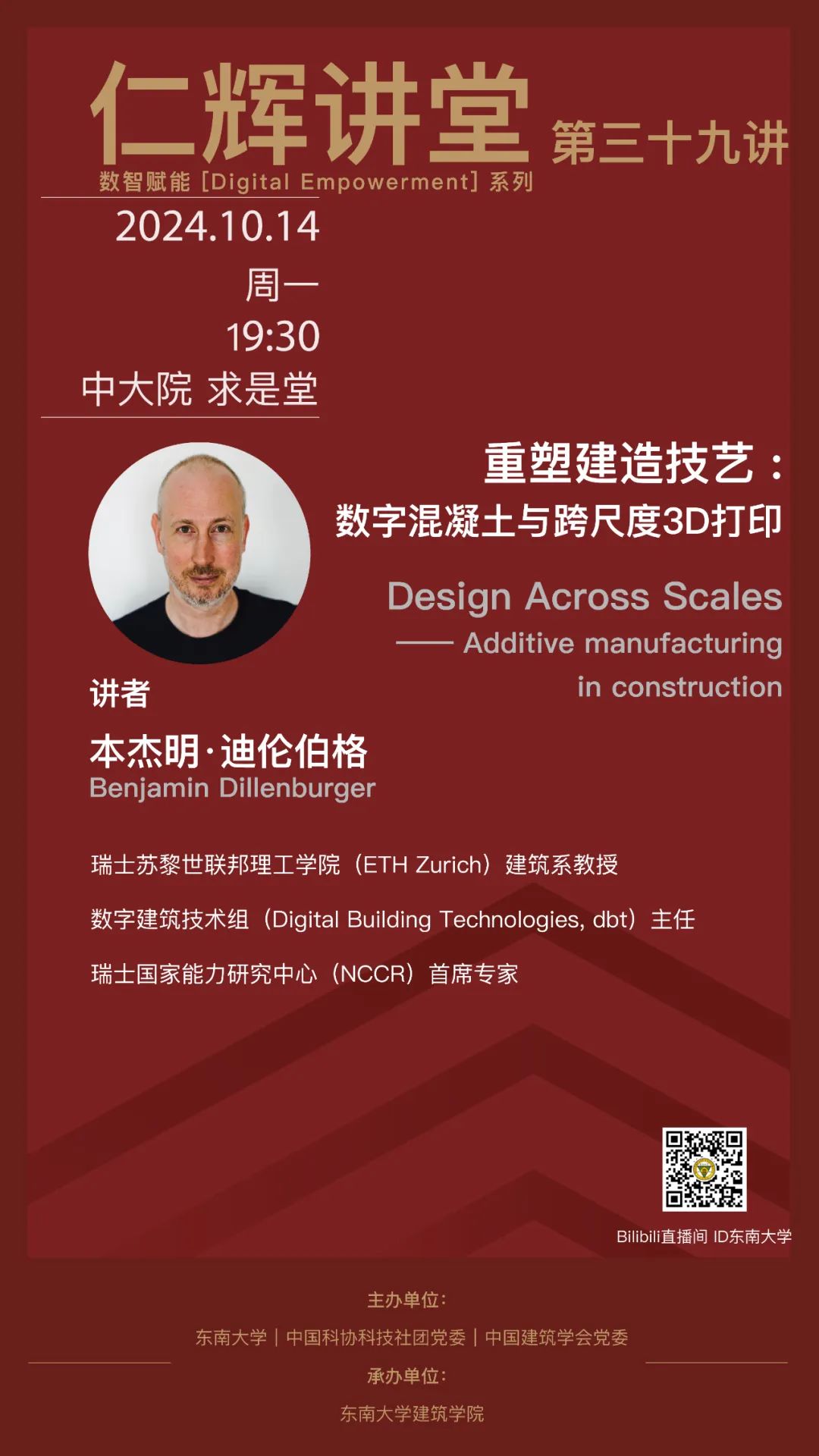 本期仁辉讲堂,由瑞士苏黎世联邦理工学院(ETH Zurich)建筑系本杰明·迪伦伯格( Benjamin Dillenburger)教授主讲,采取线上线下同步直播的方式开展。