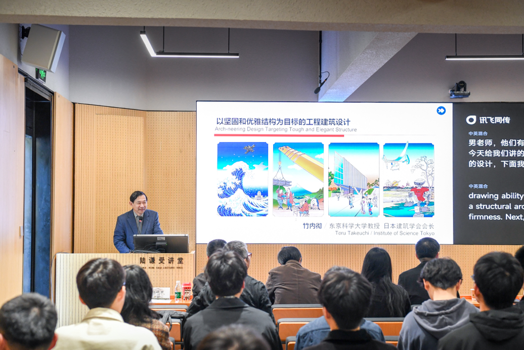 揭牌与签约仪式之后,竹内彻教授做了题为 “向着坚固和优雅的工程建筑学设计”的学术讲演,深入浅出地展现了建筑结构设计的新理念,竹内彻教授身体力行的模型演示和图文并茂的原理阐述,得到了在场师生的共鸣。在提问环节,竹内彻教授与师生们进行了互动与交流,气氛热烈。