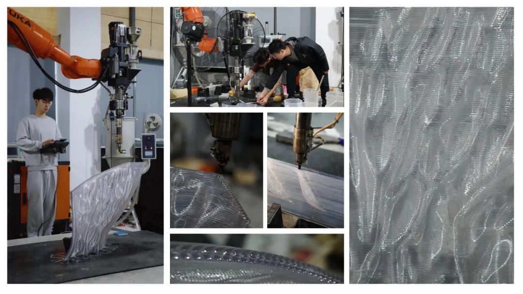项目采用了CNC切割与弯折的金属结构框架与机械臂增材建造技术相结合的复合建构体系,整合数字化建造技术,以实现复杂结构的高精度控制。
