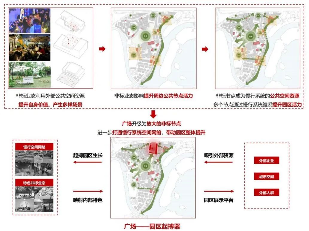 海珠同创汇园区有着便利的交通条件和丰富的自然景观。园区内的慢行空间系统复杂多样,整合了公共空间和景观资源,是园区的最大优势之一。园区的前广场是慢行系统的空间枢纽,设计希望利用广场的空间结构优势,通过前广场的改造进一步提升整个园区的空间活力,促进产业升级。设计研究从日常生活的视角出发,以人的行为活动为重点调研,发现同创园区内已有的主理人主导的非标准化运营的业态(如竖德生活馆、扉行器无界社区等)周边有较高的活力,且在网络上较为出圈。当下社会强调人多元化的兴趣爱好和需求,非标业态的出现回应了这一趋势,是非固定形式、强调个性与差异的商业形态。经研究发现,园区内的非标业态多生长在园区已有的生态景观资源周边,在微观尺度上,这些非标业态利用外部公共空间资源提升自身价值、产生多样场景,在中观尺度上带动提升了周边的公共节点的空间活力,在宏观尺度上,这些“非标节点”成为整个园区的公共资源一部分,整体提升园区的空间活力。究其根本的机制体现为空间使用外溢,带来不同功能和活动的交叠,促进空间和业态生长迭代。所以,我们希望过空间改造和业态升级,将广场进一步打造为一个放大的公共“非标节点”,对外作为园区的形象展示,映射内部先进运营模式,对内带动空间和业态活化升级。