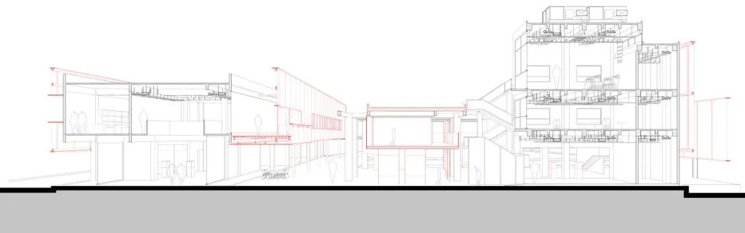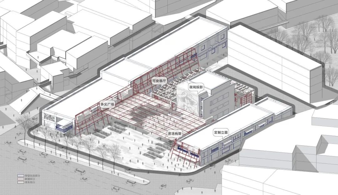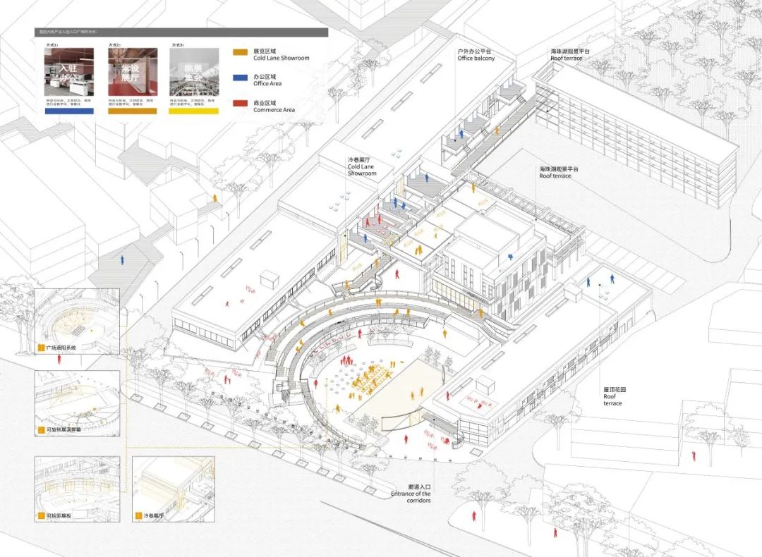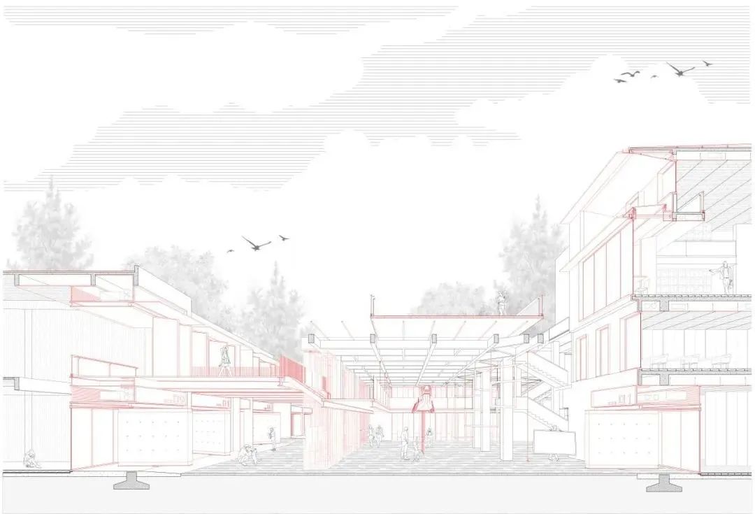 4.方案的部分决策在运维层面可能存在一定的风险。现有的方案将产业视为激进的而非保守的,而在现实运维中,商业往往被赋予保守的属性。譬如外部广场增加的半圆形廊道,在带来活力增加内容的同时,可能成为影响紧邻商店的遮蔽。