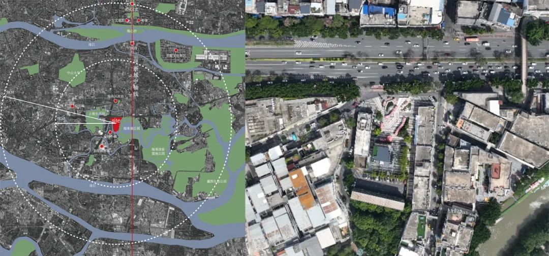 课题选址于广州市海珠区新滘中路88号海珠同创汇园区中区广场,该园区地理位置优越,交通便利,毗邻生态公园,曾是仓储物流等低端业态集聚的老旧厂房,经改造成为生活办公综合体。具体改造目标为其中区广场,位于园区的入口区域,包含三栋建筑及一活动广场,建筑面积约0.6万㎡,以商业和时尚设计产业为主。随园区不断的滚动更新开发,中区广场不再满足现有的使用需求,需对其进行新一轮的调整和改造。