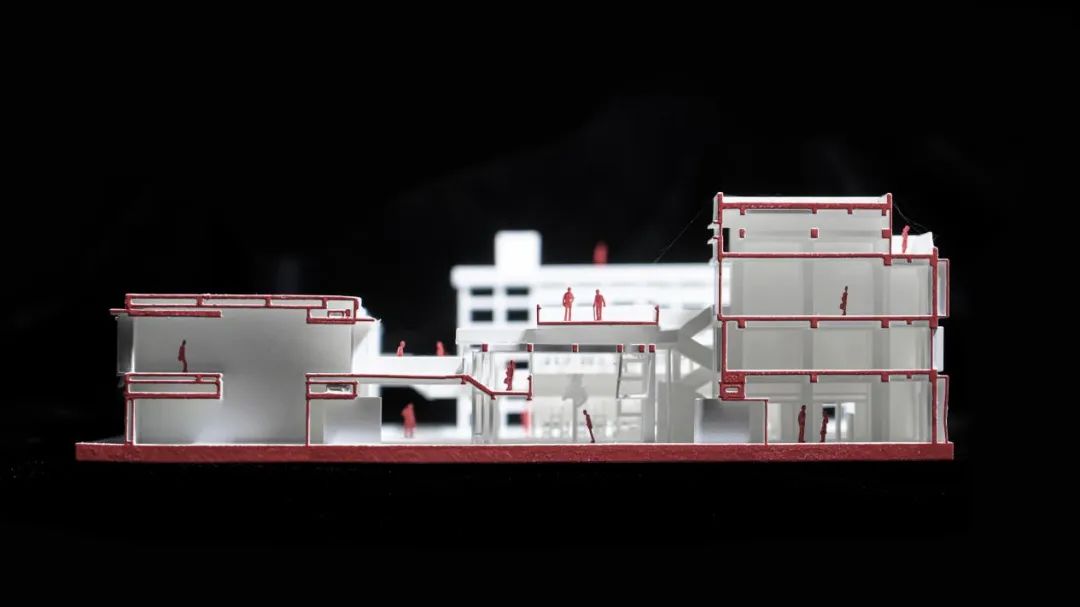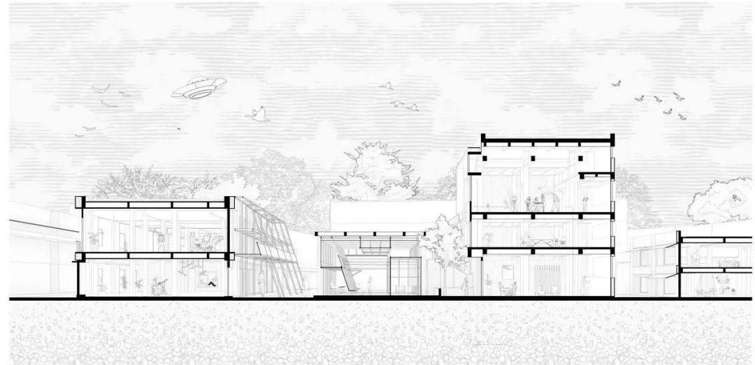 4.方案的最大特点和潜力其实是在轻质结构形成的腔层空间上,通过悬挑不同的距离形成不同尺度的空间,但这一特点和潜力与方案概念“园区起搏器”关联度有待考虑。