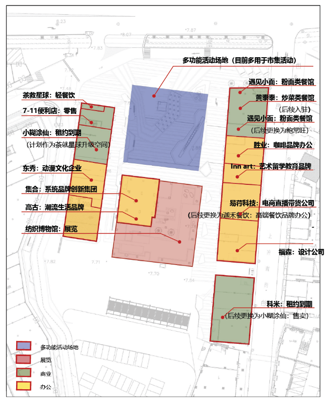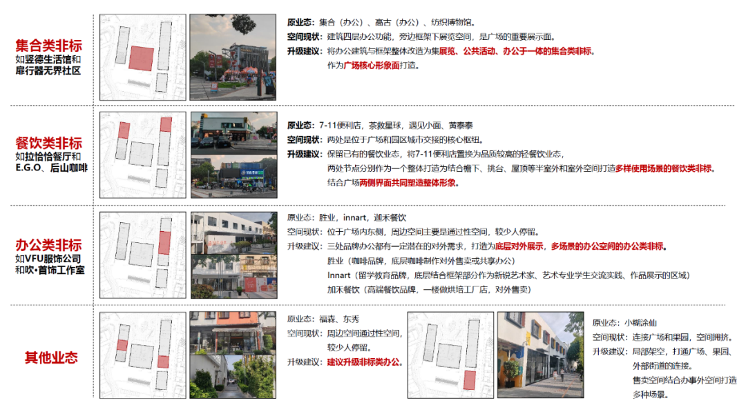 场地目前业态较为丰富(商业、办公、展览、多功能活动场地), 但单个业态使用场景和空间模式较为单一,细分的功能需求体现不足。整体上各功能空间联系性不足。设计依据园区内非标模式研究结果对广场业态做整体提升。