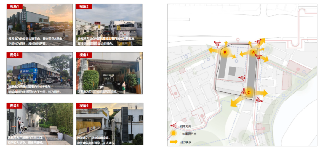入口广场与园区空间通过下图三个节点相连,三处节点都有空间较为拥挤的问题,且与园区慢行空间系统有潜在的联系,其中A、B节点人流量较大是广场与园区和城市联系的核心节点。设计对这几处节点进行重点改造,进一步打通广场与园区慢行空间系统的联系。
