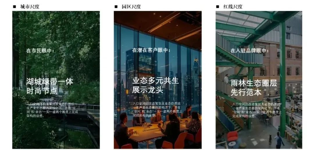 设计理念融合了有机产业生态圈与雨林式产业创新的概念,希望将入口广场作为园区整体产业转型升级的开始。对市民而言,广场是湖城绿带一体的时尚休闲节点,设计改造系统性的“C”形廊架体系构建动静空间;对潜在客户而言,广场是业态多元共生的展示龙头,设计补位了时尚产业,并引入品牌临时及常设展览;对入驻品牌而言,广场是雨林生态圈层先行范本,设计依产业目标布局业态空间促升级合作。在此定位之下,设计布局水平向北动南静、垂直展览办公分层,设不同层次的观景点,塑造多功能入口广场,提升园区整体形象。