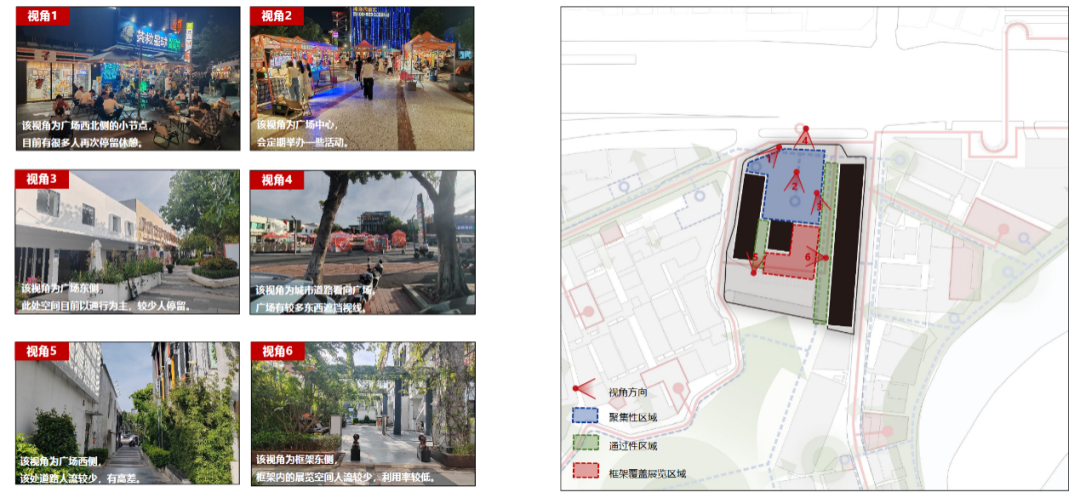 3组-设计策略1广场内部空间可以分为:休憩活动区域,通过性区域,框架覆盖展览区域。已形成承载了多种活动的公共空间节点。广场空间和建筑立面要素较多,缺乏整体性空间和形象,广场和建筑的各部分功能和空间较为独立,使用场景单一。设计延用园区内非标空间节点的形成机理,整合现有空间资源,将广场打造成富有活力的园区展示平台。