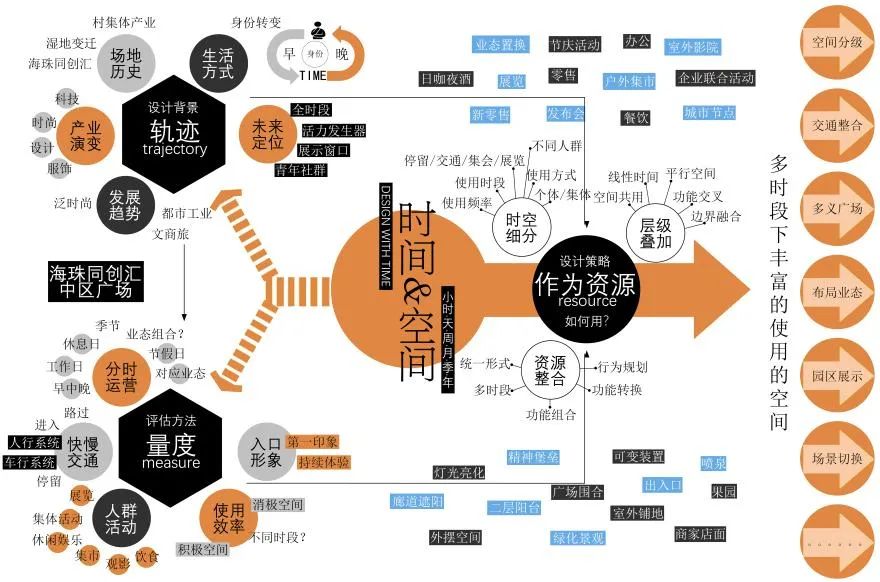 时间与空间是贯穿于建筑始终的两个不可分割的要素,它们共同影响建筑的知觉、功能、文脉等各纬度属性。本方案我们以时间为主要的切入口,从时间轨迹、时间量度、时间资源三方面视角去调研评估并设计。通过关于整个园区人群及场所的时间分析,提出“时间为引,活力整合”的理念,通过空间的整合设计,提升广场业态及公共空间在各个时间维度上的活力性,打破传统办公园区活力性较为贫乏的弊端,以各地点各时间点行为的分析,挖掘同创汇园区的潜在活力点,并将之融汇于广场空间,使该广场可成为园区风貌展示的标志。
