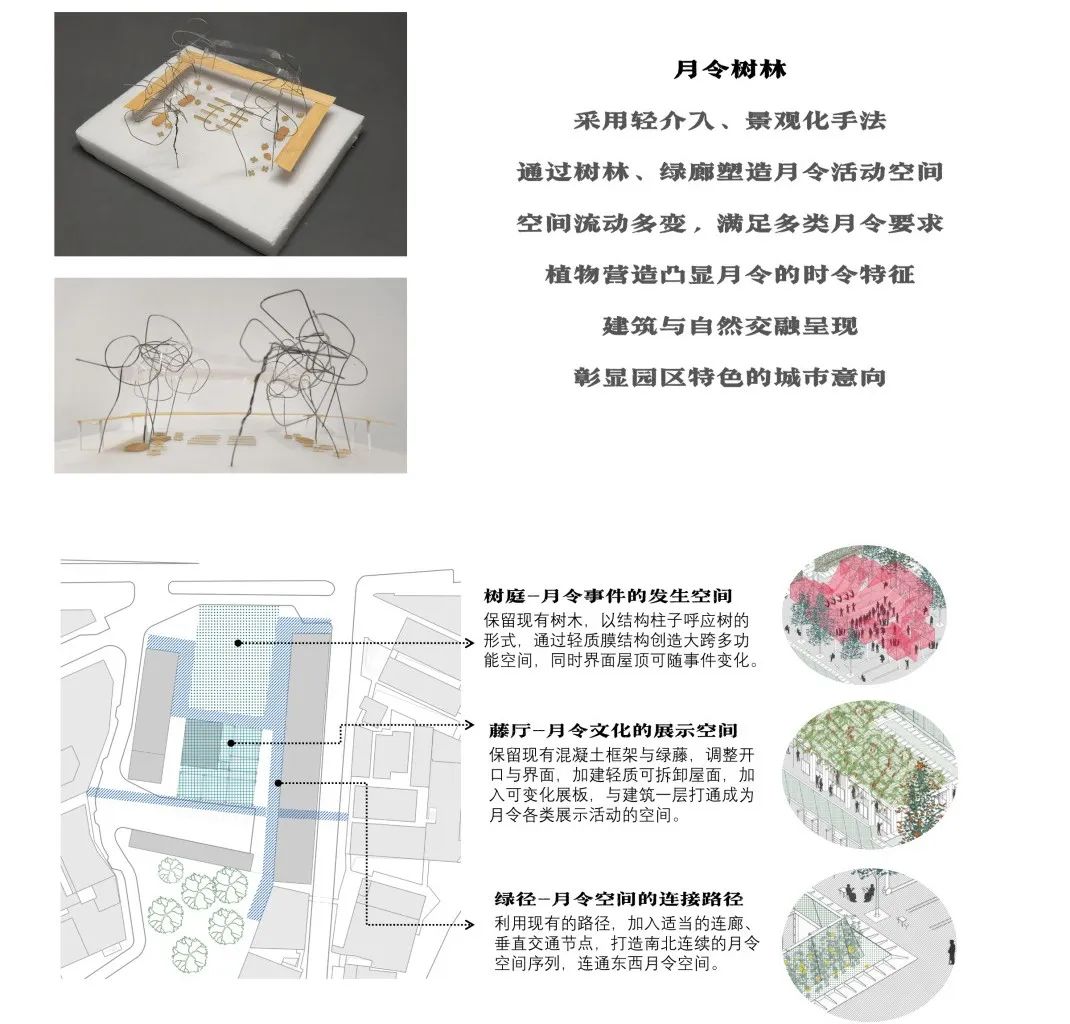 海珠同创汇所在的半岛一直作为生产空间,在产业的变化中被塑造着,从最初的上涌村的果园到村集体的纺织工厂再到如今的生态优势突出的创意园区,这一演变过程中,月令秩序有兴盛也有失落。方案从场地历史记忆出发,向上溯源,复兴生产空间的秩序-月令文化。通过广场更新优化现有月令事件,构建当代海珠同创汇“新月令体系”。整合提升园区现有资源,塑造园区核心竞争力的文化。中区广场作为月令体系的核心空间,成为同创汇对广州,对世界亮相的窗口。