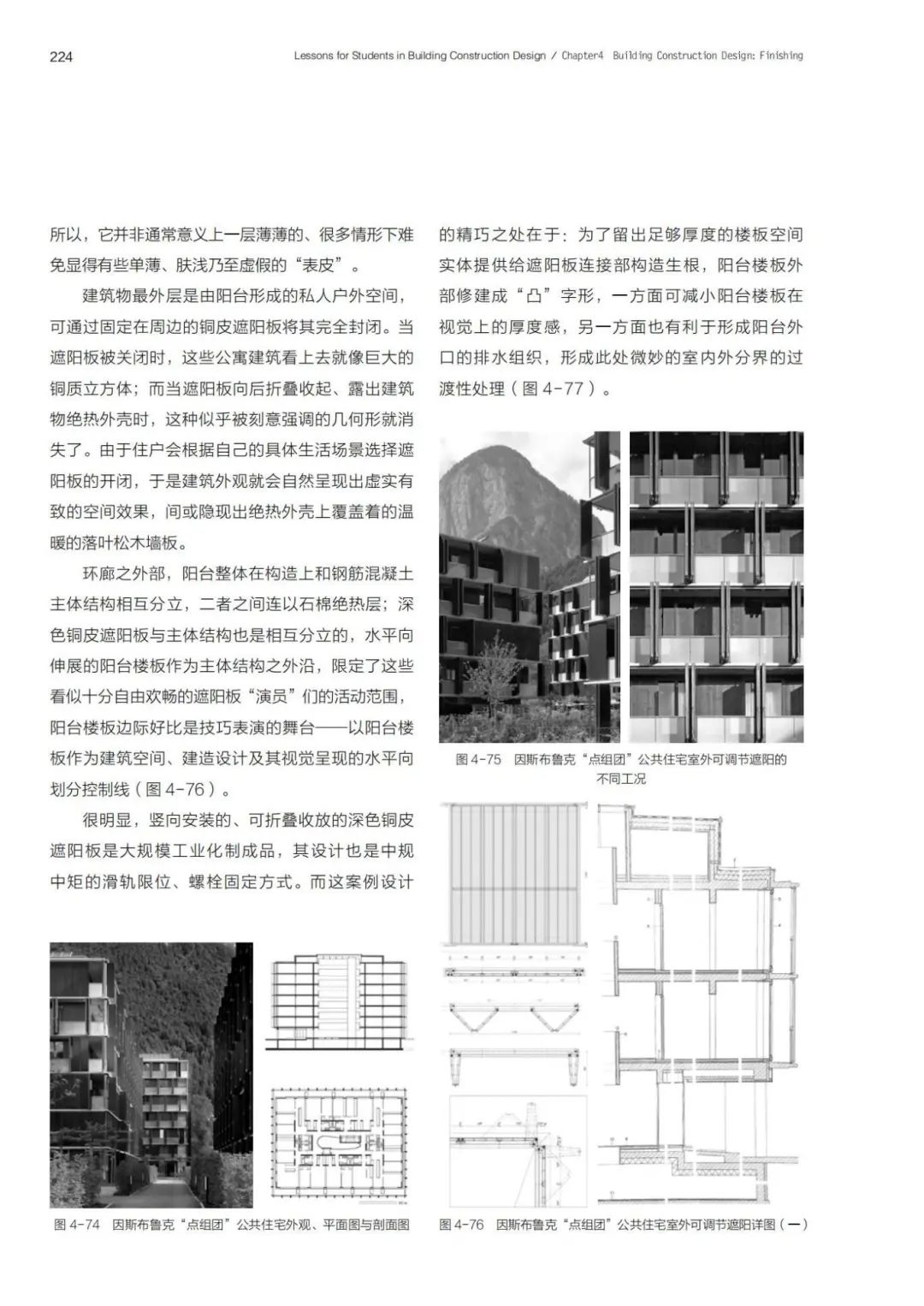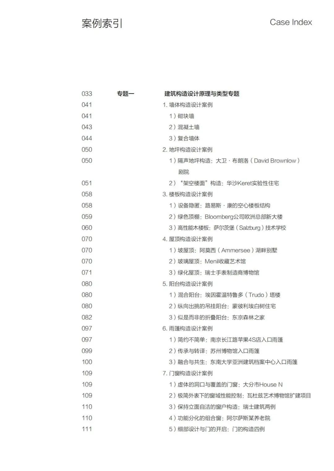 在编写思想上聚焦“设计思维”,相应地,在编写体例上专列“案例解析”,故此专门编写详细的案例索引置于目录之后,便于使用者迅速查找、做设计参考时获具体启发。选例则大量采用现当代建筑设计著名案例,辅以三维构造设计分析图或实景照片,界面友好。全书总计63万字,案例解析64组,对于设计主体的意图和相应做法给予了足够关注。