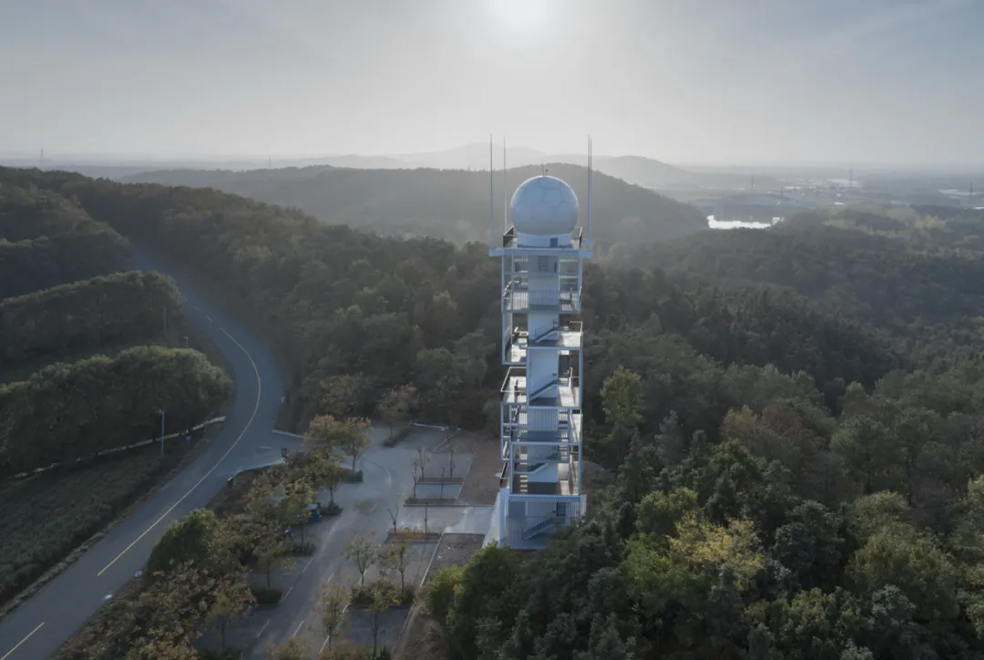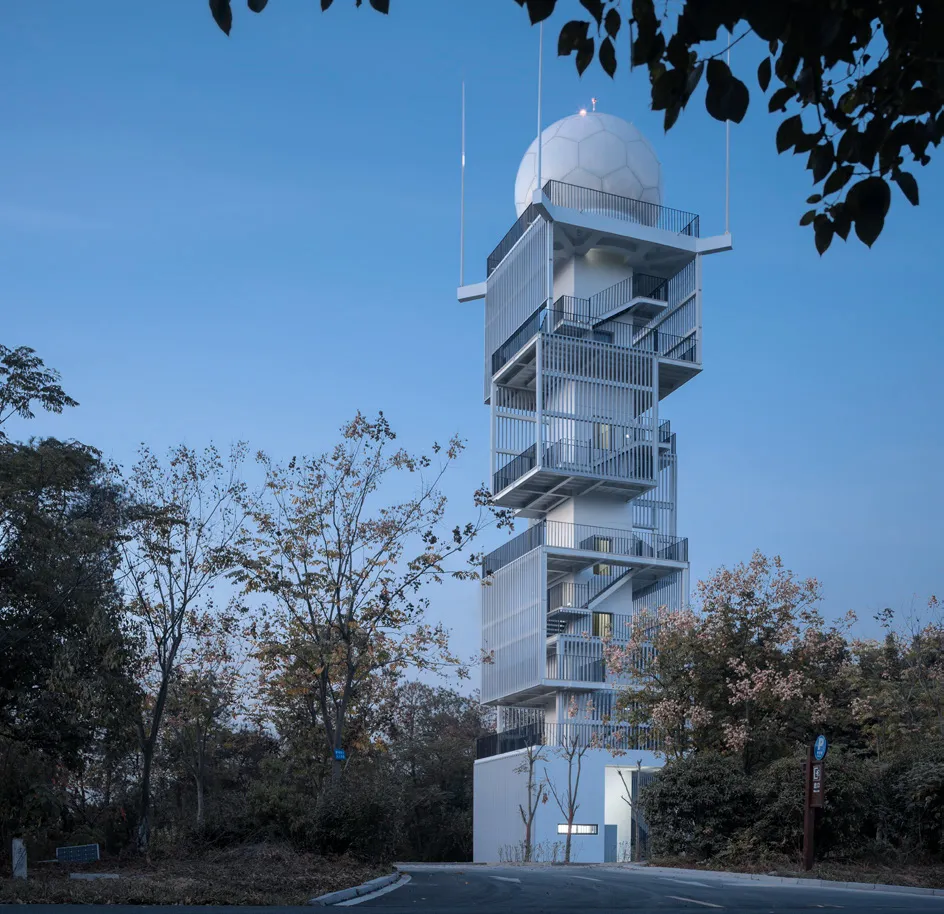 气象塔位于游子山国家森林公园内,设计师希望它不仅是一个功能性的基础设施,而是一个新的媒介,成为基本市政功能与环境和人的联系体,形体上改变常规雷达观测塔的形象,与周边优美的风景有机协调,并且具有游客观光的功能,成为当地的一个景点。设计希望以尽量轻和透的形式触碰场地,缩小占地面积,减少对环境的干扰,以更加和谐的方式与场地产生互动。概念的原始设想来自与周边的树木,希望混凝土塔体如同一颗生长的树干,而钢结构楼梯缠绕上升,楼梯平台盒子则挂在树上,形成不同高度和不同方向的观景器,游客可以在步移景异之间登高望远,区别于传统塔更重视顶层的观景设计,通过空间节奏的变化将30米的登高过程转换成愉悦的观光之旅。