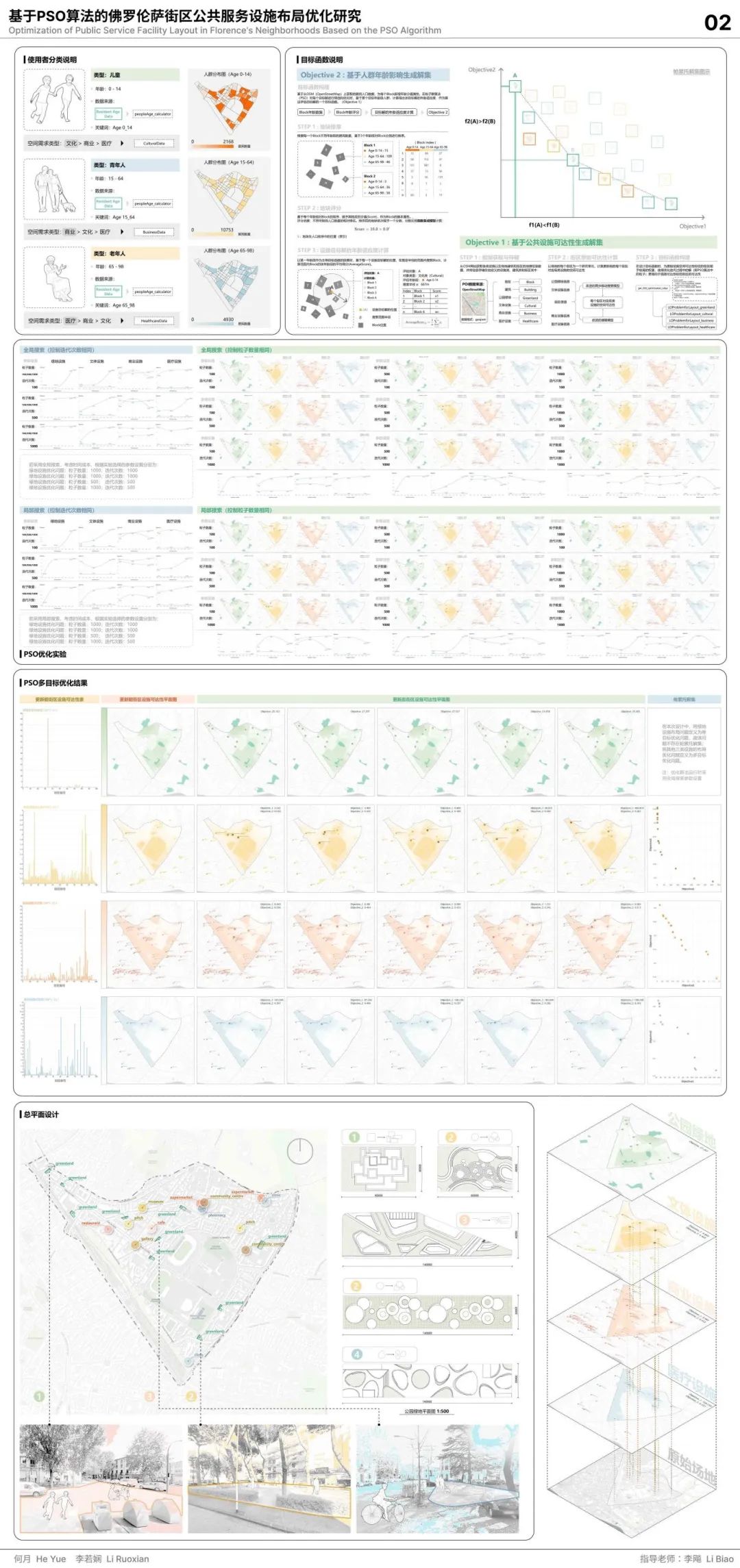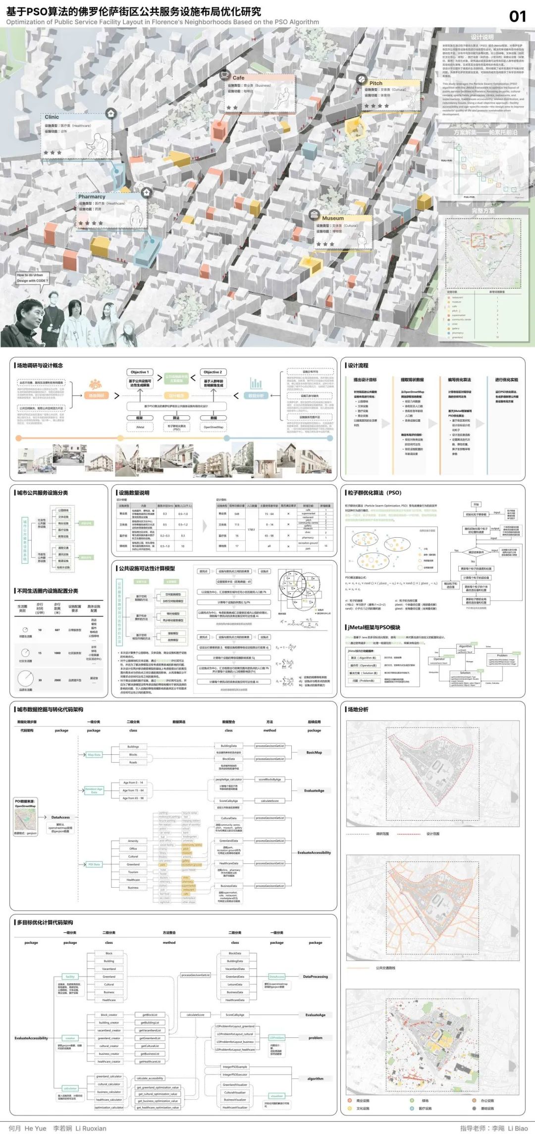 本研究旨在通过粒子群优化算法(PSO)结合JMetal框架,对佛罗伦萨街区的公共服务设施布局进行优化设计,解决现有设施布局中存在的便利性不足、分布不均及功能冗余等问题。以公园绿地、文体设施(如社区文化中心、球场)、医疗设施(如药店、小型诊所)和商业设施(如餐饮、超市)为优化对象,研究通过提高设施可达性和匹配人群年龄需求的双目标优化策略,生成更具合理性和适用性的布局方案。该设计不仅提升了居民的生活便利性,同时缓解了城市资源的不均衡分配问题,为佛罗伦萨实现更加宜居、可持续的城市空间提供了科学支持和参考模型。
