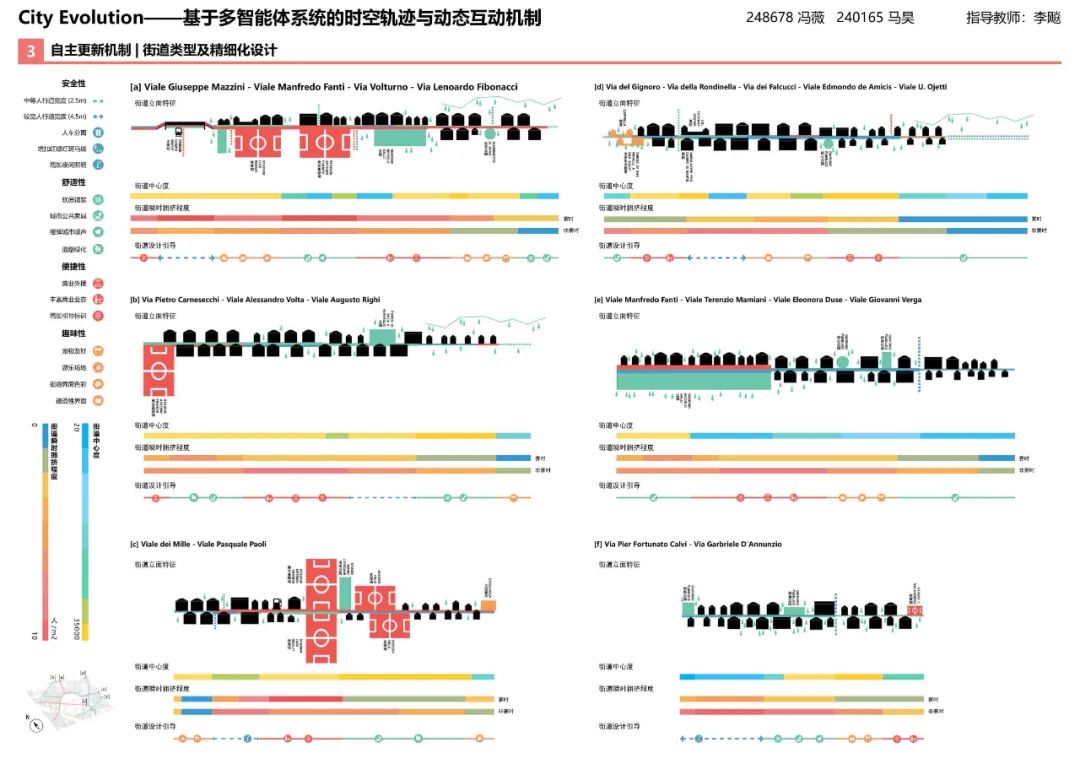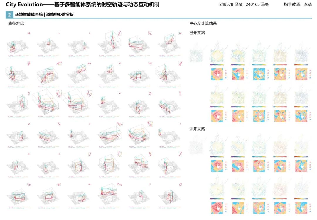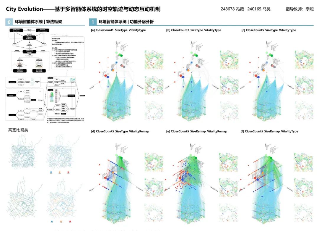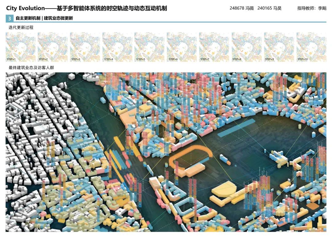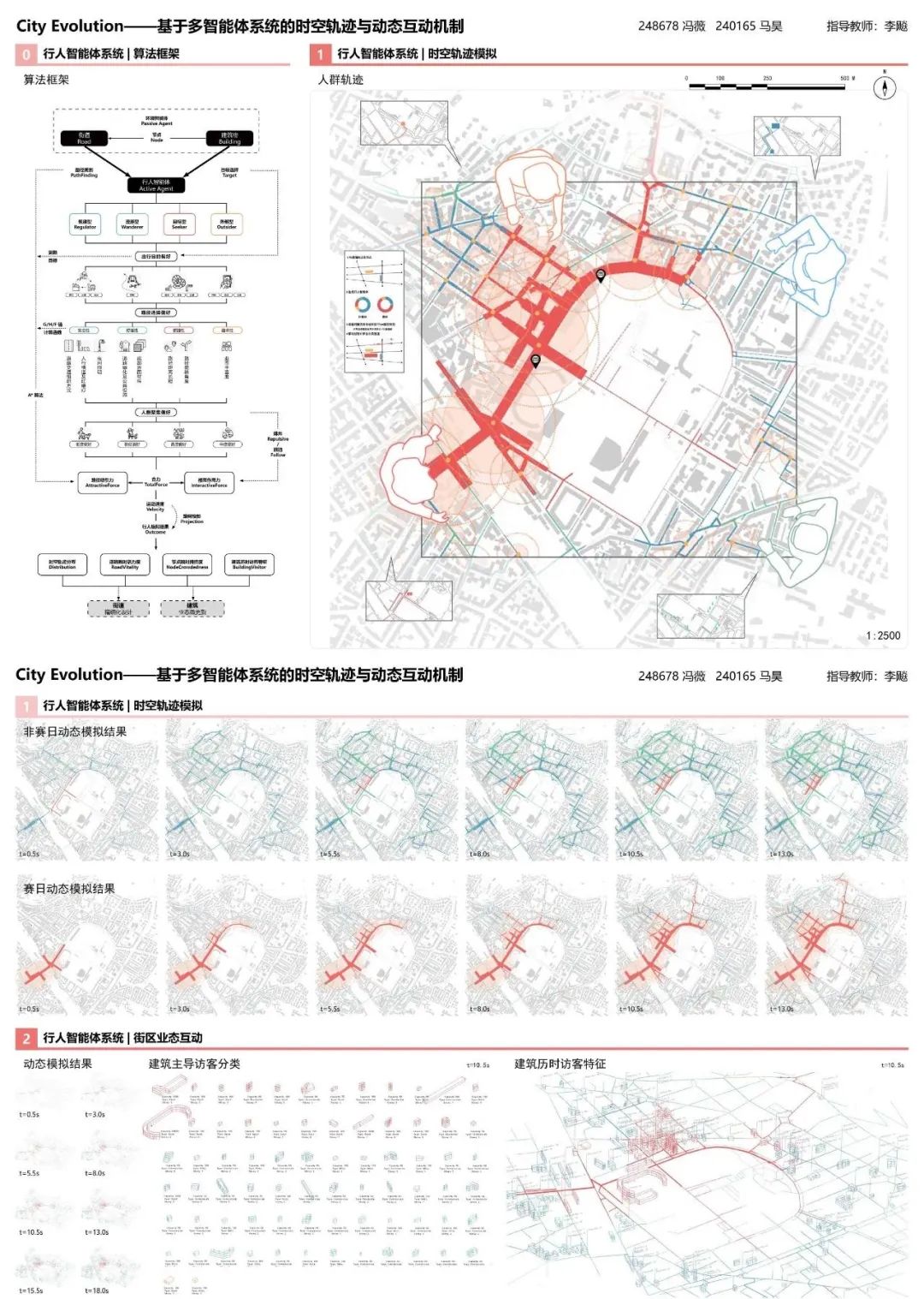 City Evolution-街道步行空间的自主更新:关注公共空间和建筑空间的演变,通过主动智能体(行人)与被动智能体(空间)的系统互动,分析城市空间与行人活动轨迹的关系,动态调整步行空间特性,最终提升步行空间活力,以反映城市空间的自我优化过程。