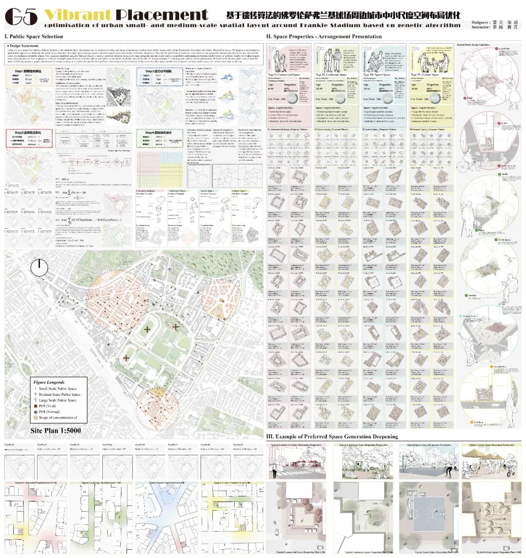 本设计通过多目标优化方法,历经前期定向筛选、遗传算法优化、活力分布模拟和空间深化设计四个步骤,成功优化了弗兰基球场周边中小尺度公共空间的布局,提升了区域活力与功能多元性,并最终生成一份初步公共空间设计导则,从场景轴测、街景透视、空间平面等多维度进行表达。我们希望能够在未来将此设计思路应用于更多地区和城市,为其提供参考与借鉴价值。
