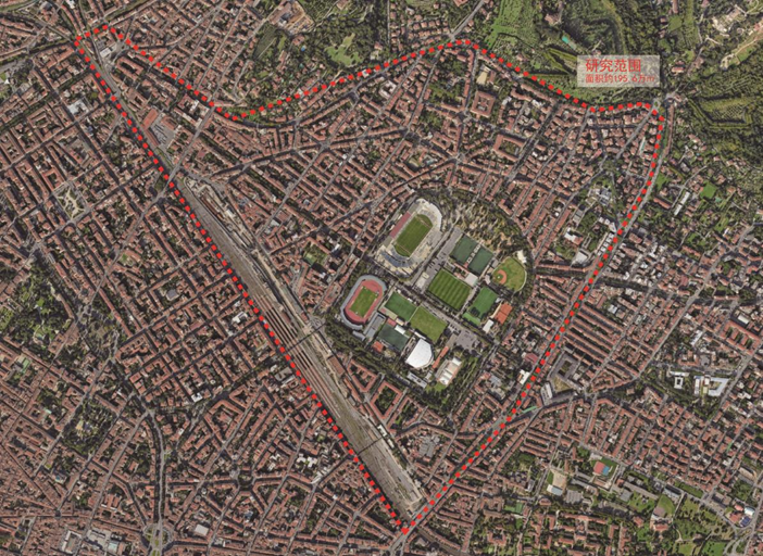 弗兰基球场现在是意甲球队佛罗伦萨足球俱乐部的主场球场, 每年8月至次年5月为意甲赛季。球场最大上座纪录是58271人,在1984年11月25日的一场佛罗伦萨对国际米兰的意甲比赛中创下的。弗兰基球场周边比赛日人流量较大,但从车站进入体育场馆,仅通过一座步行桥连接南北。停车困难,居住区周边无足够的商业和公共活动设施。非比赛日人流稀少,街区景象萧条,空间时效性比较强。在弗兰基球场的最新改造方案中,其东侧半埋式的场馆连接了南北两侧的空间,在非比赛日也希望吸引人流进入场地中进行公共活动,为此必将为更大范围内的人流车流以及日常生活带来一定的改变。本次城市设计课题以弗兰基球场的更新改造为契机,通过公共空间与交通的梳理、人流车流的引导、功能的重置等手法来重塑街区,希望提升佛罗伦萨的吸引力,达到将佛罗伦萨打造为欧洲文化和体育中心的目标。