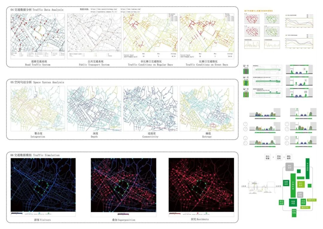 设计围绕佛罗伦萨弗兰基球场周边区域在比赛日的交通问题展开,包含交通效率提升和与效率提升后街道的弹性使用可能两面。通过交通数据分析和空间句法分析,识别交通瓶颈,优化交通流线和空间布局并利用交通模拟确保方案的有效性。