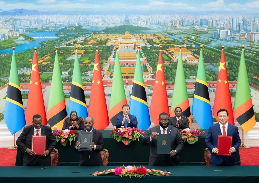 2024年9月4日,国家主席习近平同坦桑尼亚总统哈桑、赞比亚总统希奇莱马共同见证签署《坦赞铁路激活项目谅解备忘录》(图源:新华社)