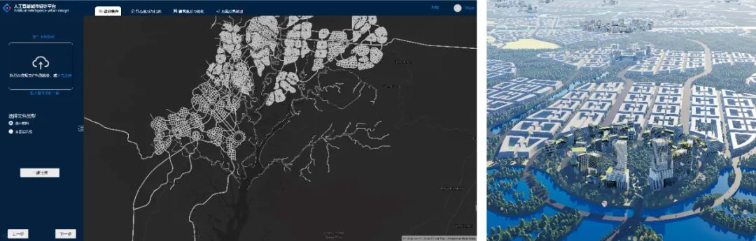 ③ 城市智能建模:依托智能城市团队研发的人工智能城市设计平台,采用“人工设计主路网形态+智能生成细化路网与建筑”的人机协作模式,在确保形态设计意图落实的同时将建模与细化工作交由智能平台,有效提高了设计效率,最终在2天内完成了115平方公里建成区所有街坊地块建筑的建模工作。