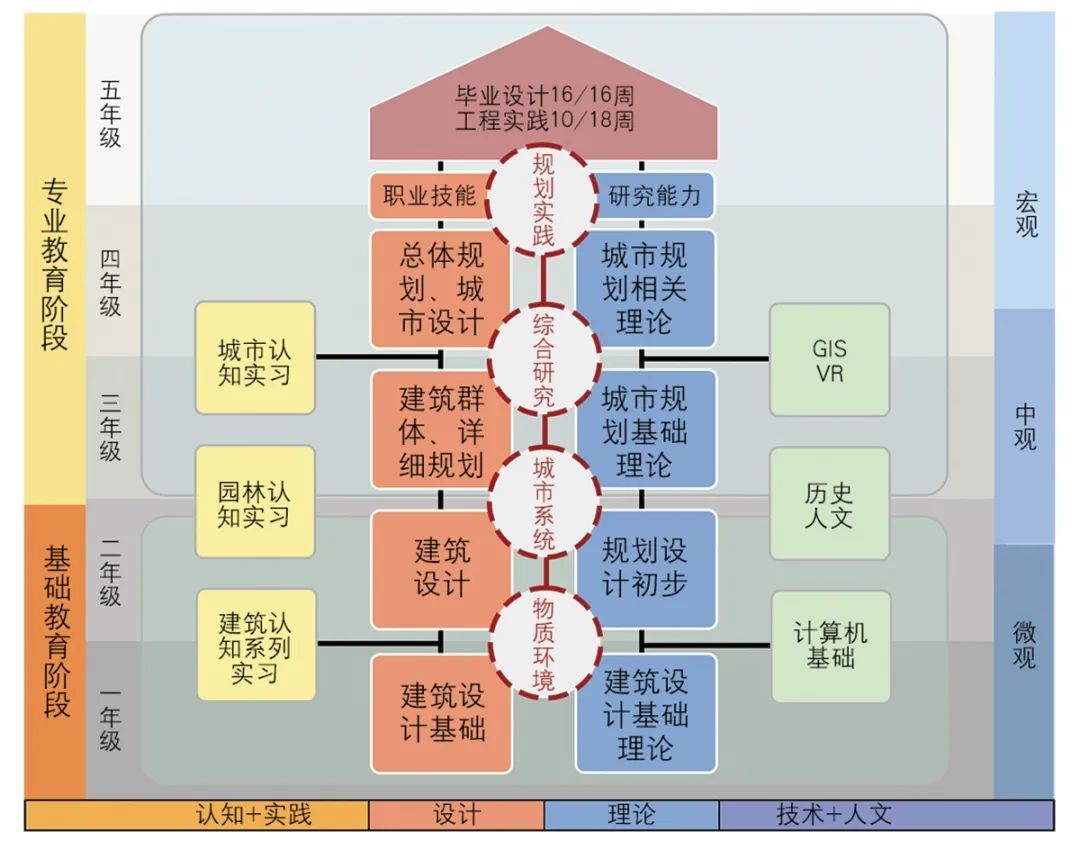 伴随快速城镇化进程,传统基于建筑学的物质空间规划在应对大规模城市建设时面临严峻挑战,城市规划作为一项重要公共政策的属性越来越突出。2011年城乡规划学升格为一级学科,进一步确立了其作为一个完整学科的理论内涵。在教育层面,好色tv 结合建筑类学科的特点,提出了“博雅教育”的教育理念,并强调建筑类学科的职业素质和实践能力的培养,将“博雅教育”与“职业教育”有机结合[2],形成了本科教育的“三统一”原则,即职业教育与素质教育的统一、教育过程阶段性与持续性的统一、知识结构与综合能力的统一。