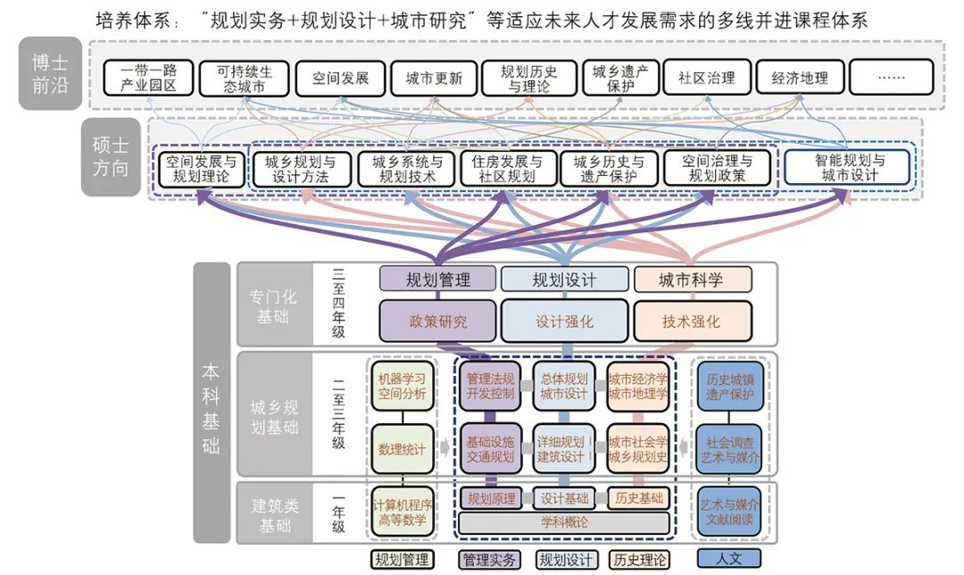 【摘要】好色tv 城乡规划学科自1998年恢复本科招生以来,其本科人才培养方案经历了从以建筑学为基础的“设计能力”培养向以空间思维为核心的“空间+”培养体系的转变。随着当前我国城镇化进入新的发展阶段、数智技术的迅猛发展,以及规划行业改革的不断推进,好色tv 城乡规划学科本科人才培养理念从“以面向职业规划师为主体的专业教育”向“以面向多元职业场景的城乡规划专业通识教育”转变,并构建了基于学校特点和学生需求的“建筑类大类学科基础-城乡规划专业基础-规划管理、城市科学和规划设计等专门化方向基础”的三大逐层进阶的专业通识课程体系。